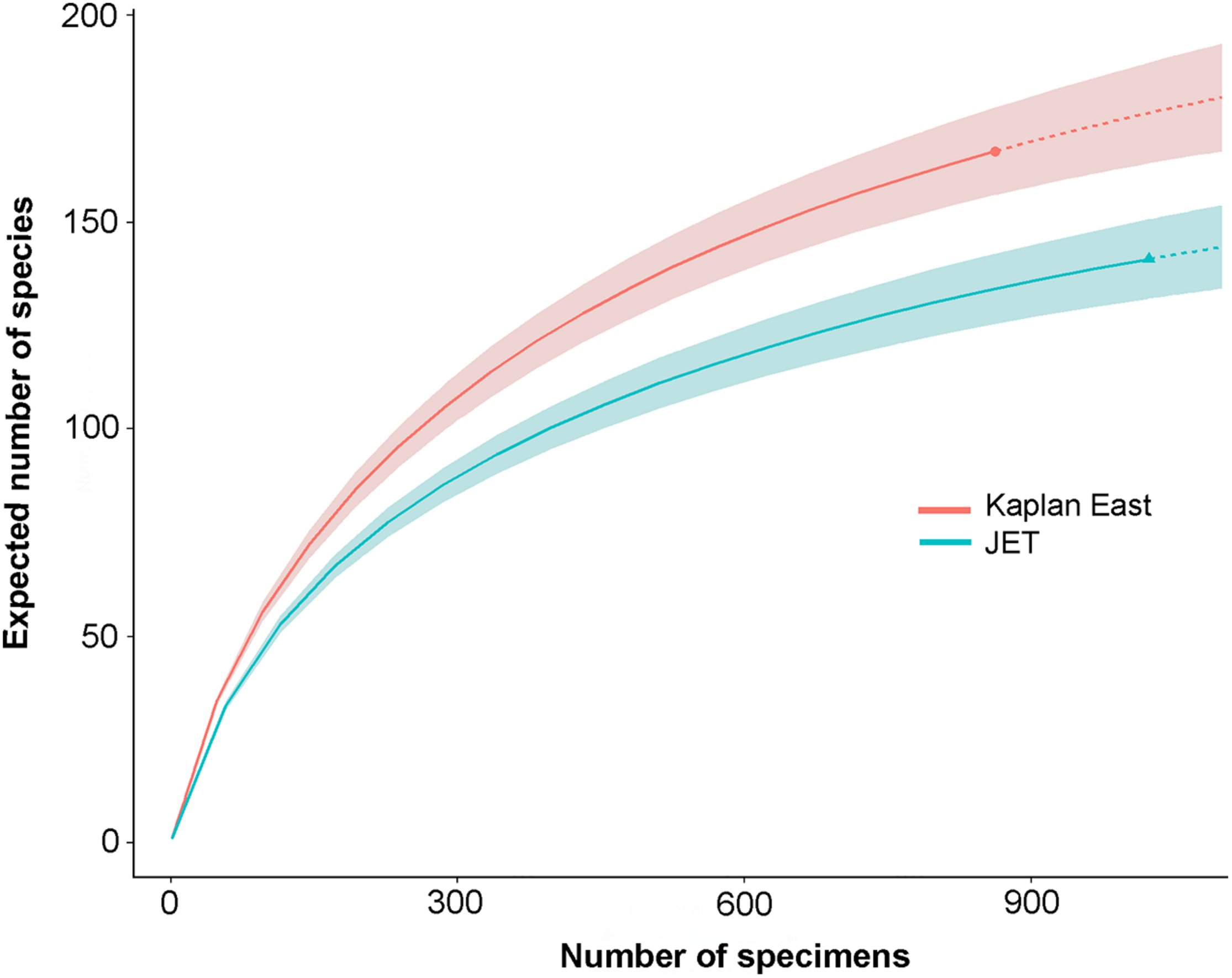 Rarefaction curves with 95% confidence limits for foraminifera from the Kaplan East (∼15°N, 119°W; ∼4100 m depth) and JET (09° 14′ N, 146° 15′ W; 5300 m depth) sites. The curves are based on data from the 0-1 cm layer of subsamples (6.6 cm2 surface area) of megacores, sieved on a 32-μm screen (Nozawa, 2003, 2005).