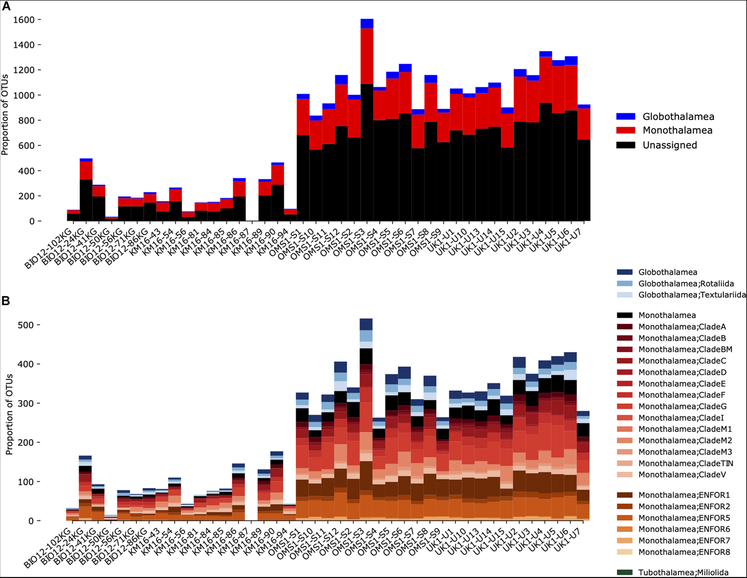 Taxonomic composition of the OTUs found in samples from CCZ sites. The top panel includes the unassigned OTUs (A), which are absent in the bottom panel where only OTUs that were assigned to Globothalamea, Tubulothalamea, and Monothalamea are shown, at a finer taxonomic level (B); note the high diversity of monothalamid clades.