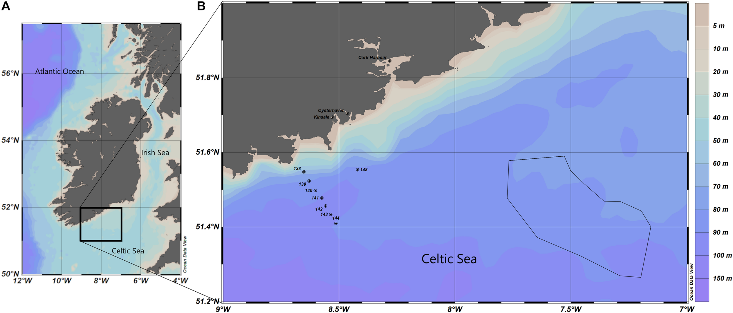 (A) Map of study area in the Celtic Sea. (B)In situ sample locations are noted as points and the polygon location for the particle tracking model is outlined by the black line. Bathymetry is represented in metres.