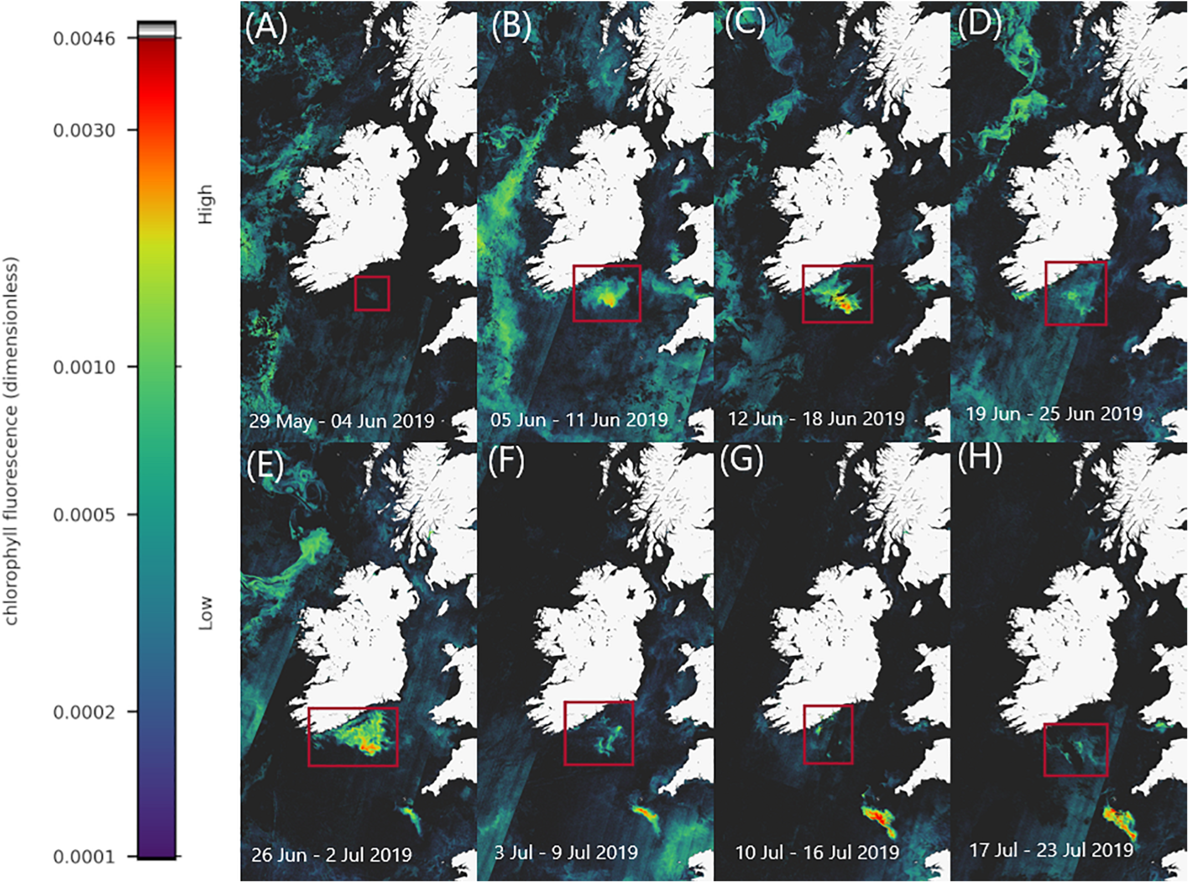 Sentinel-3a OLCI images with RBD algorithm displaying the phytoplankton bloom progression between 29th May 2019 and 23rd July 2019 (A–H). Colours indicate relative fluorescence, with warmer colours representing higher fluorescence indicative of higher bloom concentration.