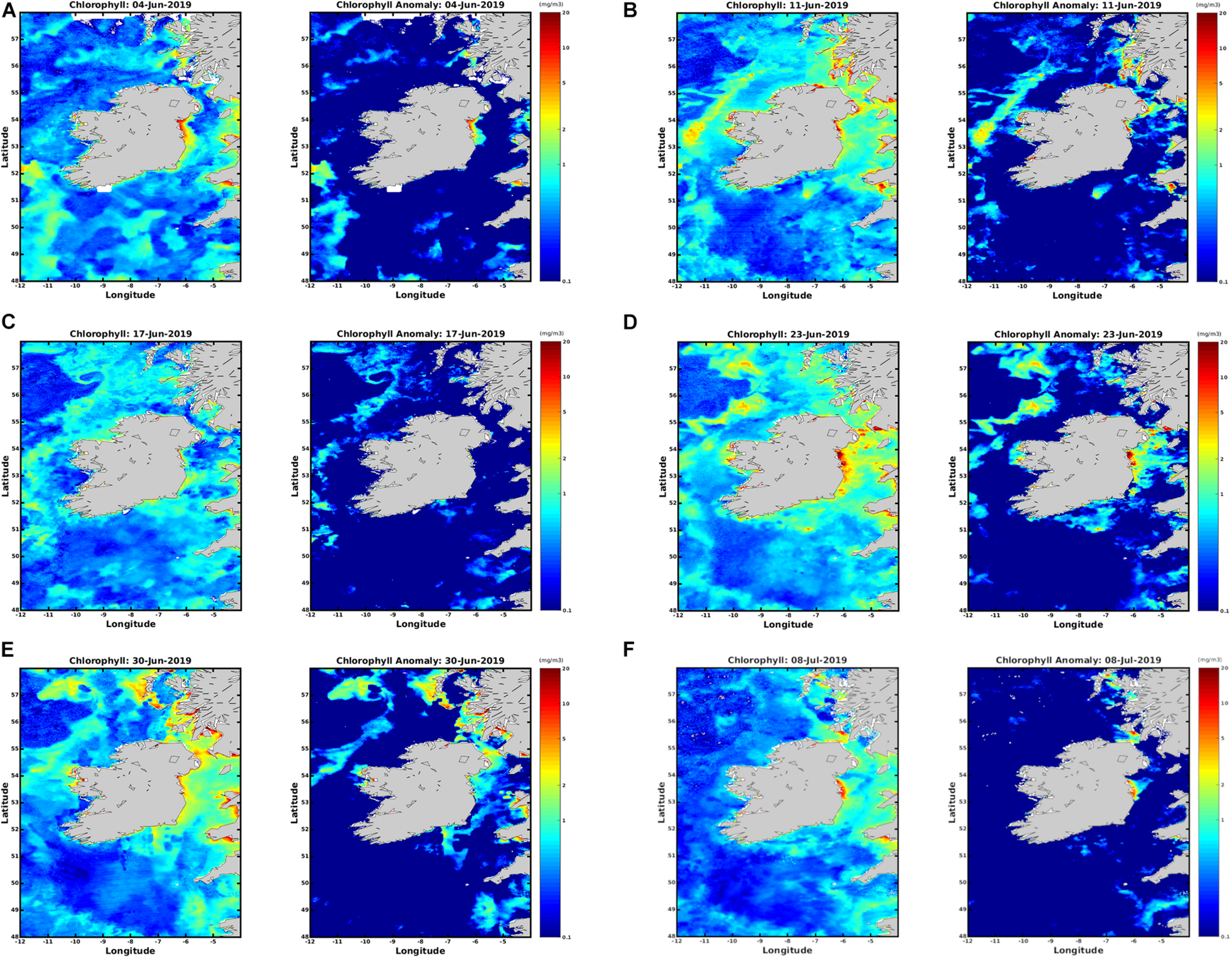 Satellite imagery was produced for the weekly HAB bulletin using an algorithm developed by Ifremer, known as the OC5 product. The level 4 Chl-a product is extracted from the IFREMER FTP site1. Matlab (MathWorks) is used to convert the level 4 Netcdf files to ∗.grd files. Matlab is then used to calculate chlorophyll anomalies from the 60-day median value calculated using data between current date minus 74 and current date minus 14. This anomaly data is rendered as .png files (Leadbetter et al., 2018).