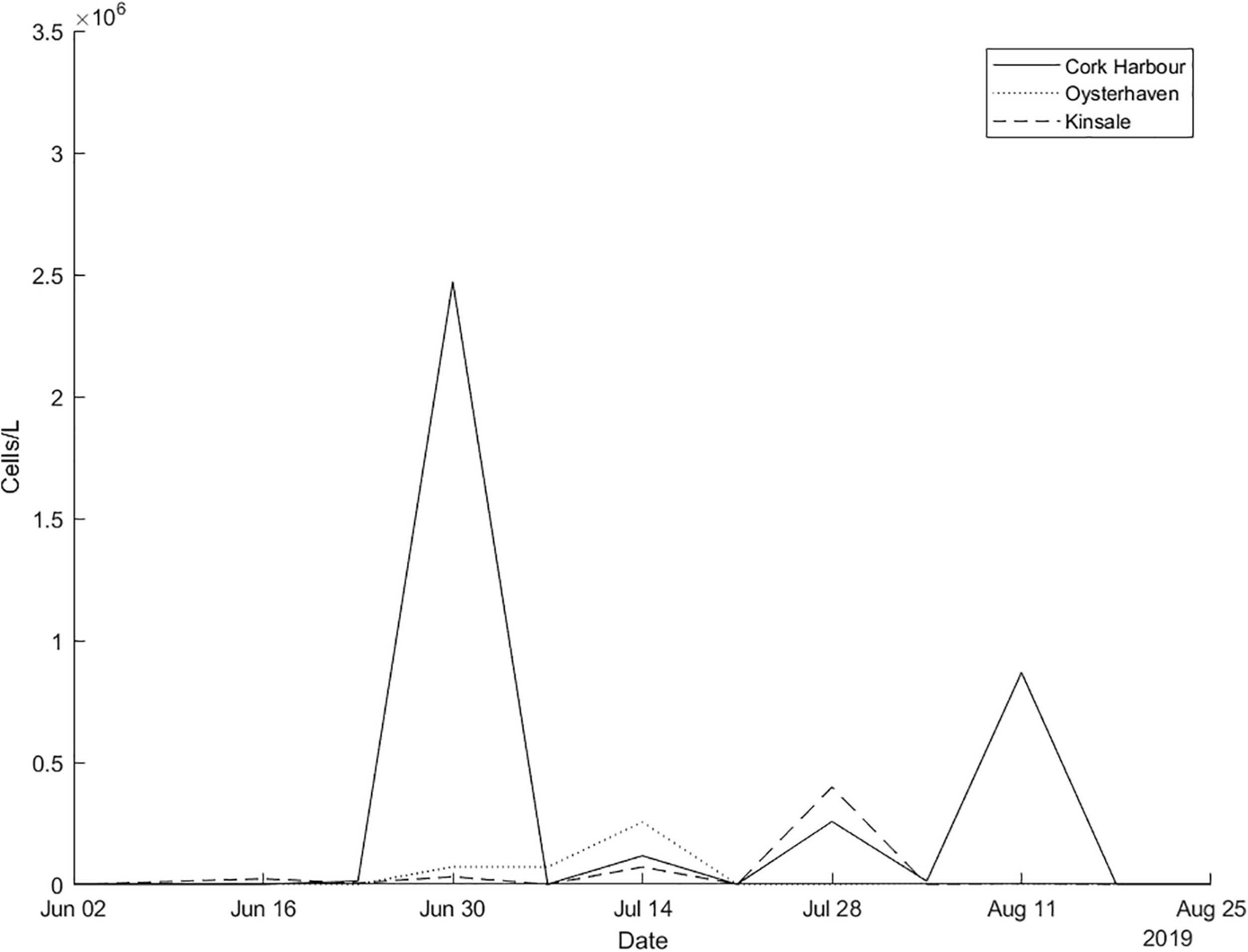 In 2019, the first inshore phytoplankton record of Karenia spp. (13,840 cells/L) in Cork Harbour was detected on 23 June. On 30 June the sharp rise in cell densities (2,471,168 cells/L) was detected, 3 days after the bloom peaked offshore. Around the same time (30 June) to the west in Oysterhaven, 80,000 cells/L were recorded in water samples. These numbers increased to 260,000 cells/L by mid-July. Further west in Kinsale cell numbers rose from approximately 71,000 cells/L on 14 July to 398,736 by the 28 July. Many other phytoplankton taxa were identified during the above dates but Karenia spp. was consistently the highest cells/L recorded in each instance (Full cell counts for the three southern stations can be viewed in Supplementary Material).