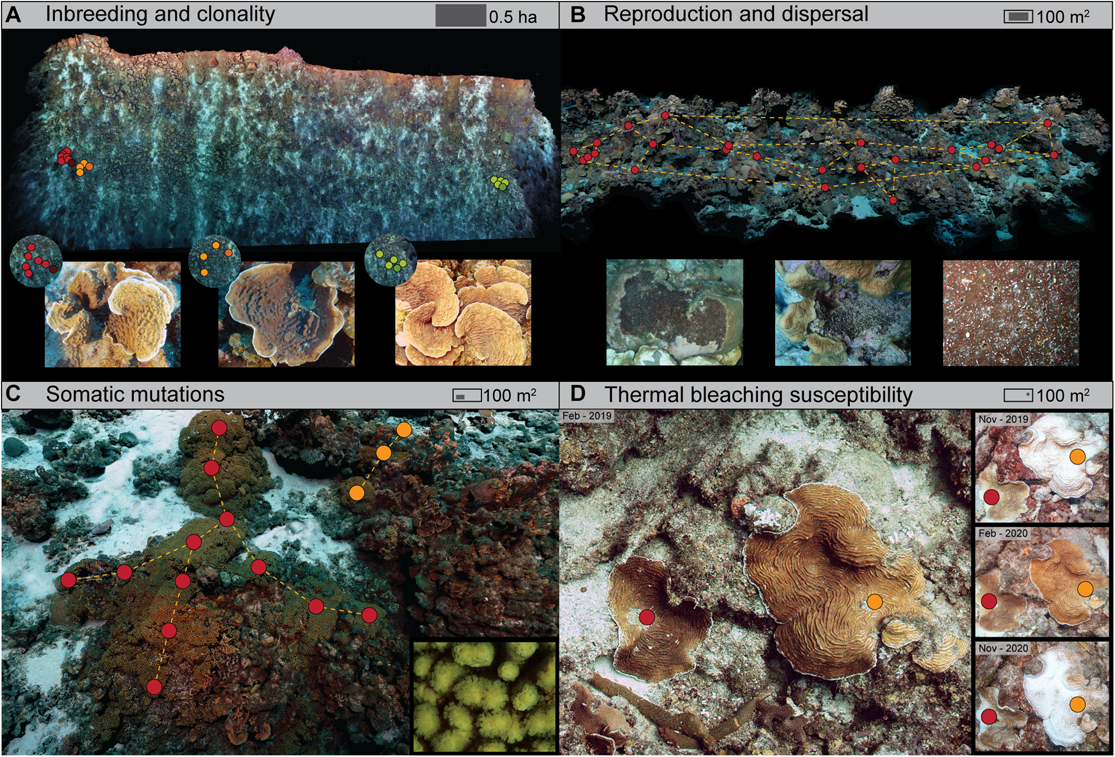 Four example applications of reefscape genomics, conducted as part of the CoralScape project in Curaçao (Southern Caribbean). This project monitors large-area plots (0.5–1 ha per plot) and focal plots (100 m2) covering a range of 5–60 m depth at eight different locations along the leeward shore. The focal plots are reimaged twice a year (using a Canon 5DsR with an EF 24 mm f1/4 prime lens and four Inon Z330 strobes) and incrementally sampled (for different taxa). Collected samples are referenced to the 3D model using video from a head-mounted camera, with the diver carrying a 96-well rack with numbered 0.5 mL tubes bungee-mounted to their forearm. (A) Broad-scale imaging (>0.5 ha per plot) to assess the impact of rapid population decline on the reproduction and genomic variation in the coral Helioseris cucullata, and to evaluate extinction risk and appropriate conservation strategies (Hernandez-Agreda et al., unpublished data). (B) Medium-scale imaging (100 m2 per plot) to understand the roles of niche partitioning and asexual reproduction in the fast expansion of coral-eroding sponges in the Cliona viridis species complex (Achlatis et al., unpublished data). Inset photographs show different growth forms and a close-up. (C) Medium-scale imaging (100 m2 per plot) to track the spread of somatic mutations in the coral Madracis mirabilis, and assess their contributions to genetic diversity in large monospecific stands (Bongaerts et al., unpublished data). (D) Medium-scale imaging (100 m2 per plot) to disentangle the role of environment and genotype in bleaching response and the overall effect of bleaching on population genetic diversity within the coral genus Agaricia (Prata et al., unpublished data). Circles represent samples of target organisms (as depicted in close-up photos) colored by genotype (except for in B).