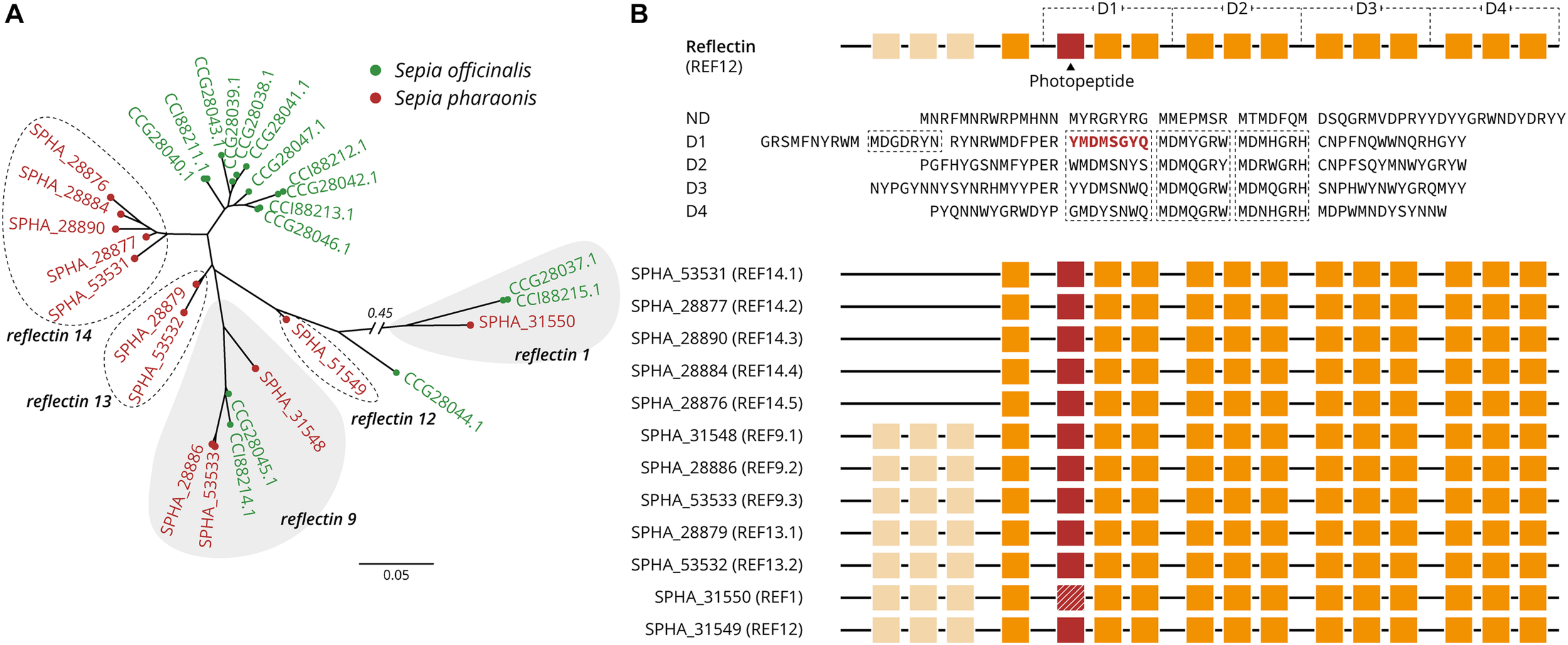 Sepia officinalis Reflectin protein sequences were aligned using Blast + v2.10.0 (Camacho et al., 2009) against both S. pharaonis protein sequences (BlastP, Coverage > 75% query, E-value threshold of 10ā20), and S. pharaonis whole genome (using tBlastN, > 75% query, E-value threshold of 10ā60). The identified reflectin sequences were aligned using GramAlign (Russell, 2014). A Maximum Likelihood (ML) tree was inferred under the GTR model with gamma-distributed rate variation (Ī) and a proportion of invariable sites (I) using a relaxed (uncorrelated lognormal) molecular clock in RAxML (Stamatakis, 2014).