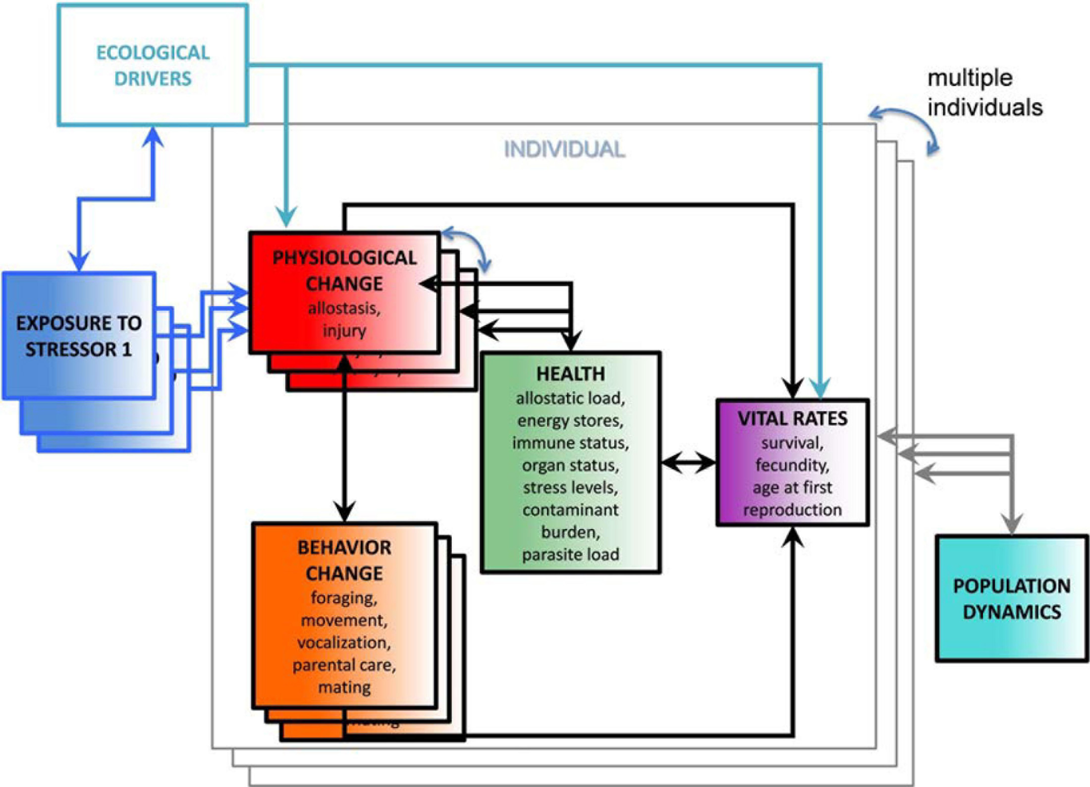 The Population Consequences of Multiple Stressors (PCoMS) framework [reproduced with permission from National Academies of Sciences, Engineering and Medicine (2017)]. Multiple slices of the PCoMS represent multiple individuals.