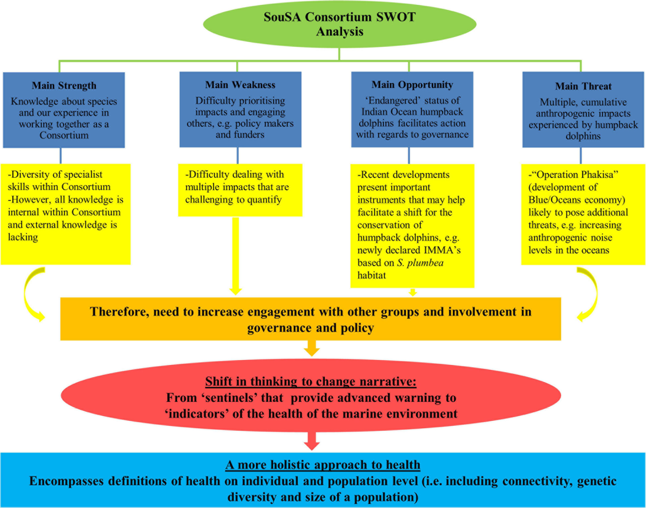 As the range, relative strength and interplay of the threats impacting humpback dolphins in South African waters remain poorly understood, setting clear priority actions is extremely challenging. To address this and determine a way forward for the conservation of the species in South African waters, we conducted a SWOT (strengths, weaknesses, opportunities, and threats) analysis in an attempt to clarify the complexities of the situation and to assist us in focussing our actions as a Consortium, in the short- and long-term, to improve the conservation of the species. Here we present the results of the SWOT analysis, some insights of working as a Consortium, and discuss them within the framework of small cetacean conservation globally.