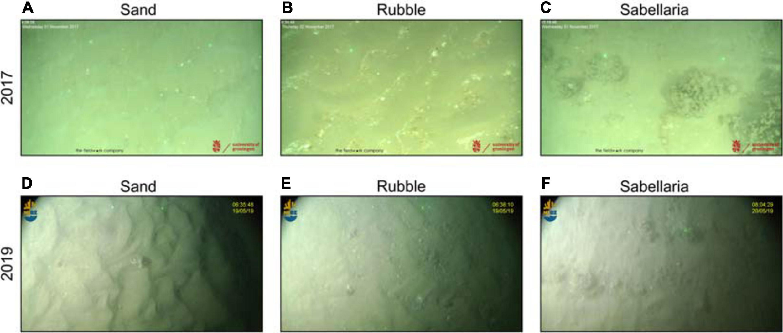 All footage with unclear visibility of the seabed was classified as invalid. Analysis of all valid footage comprised the recording of observed organisms and prevailing habitats. Specimens were identified to the lowest taxonomic level possible. Habitats were defined by their sediment features, resulting in three different habitats: (1) Sand, (2) Rubble, and (3) Sabellaria (Figure 3). Sand habitats classified all seafloors that were comprised of plain sand without any deviating features apart from some small shell fragments. Rubble and Sabellaria habitats were comprised of seafloor habitats that both contained a sandy seafloor, with coarser material like small stones and/or many shell fragments (Rubble) or Sabellaria reef fragments (Sabellaria). As a consequence, Sabellaria habitats do not necessarily have a 100% coverage of S. spinulosa reefs. For both research campaigns, an example screenshot of each habitat is shown in Figure 3.