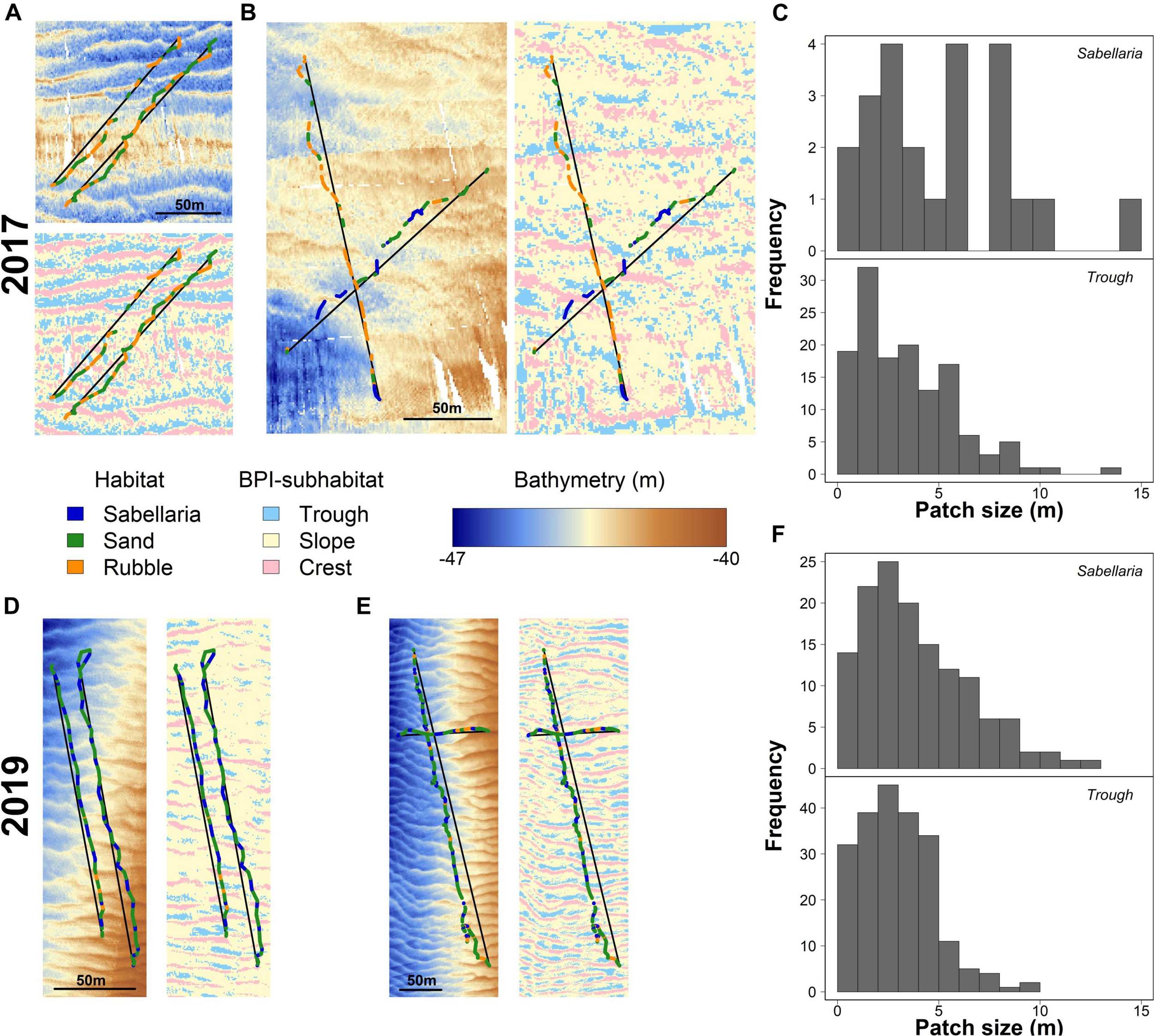 Habitat patch distributions and their link to seafloor morphology for 2017 (A–C) and 2019 (D–F). (A) detailed maps showing the bathymetry and BPI-subhabitats surrounding the video-observed habitat patches (Sabellaria in blue, Sand in green, and Rubble in Orange) for two representative video transects gathered in 2017 in the western trough. Black lines represent the line segments used to determine BPI-subhabitat sizes. Similar maps of bathymetry and BPI-subhabitat overlayed with video-observed habitats are shown for (B) 2017, eastern trough, (D) 2019, western trough, and (E) 2019, eastern trough. Histograms show the absolute frequency of the sizes for the video-observed Sabellaria habitat patches and BPI-subhabitats “trough” for 2017 (C) and 2019 (F).