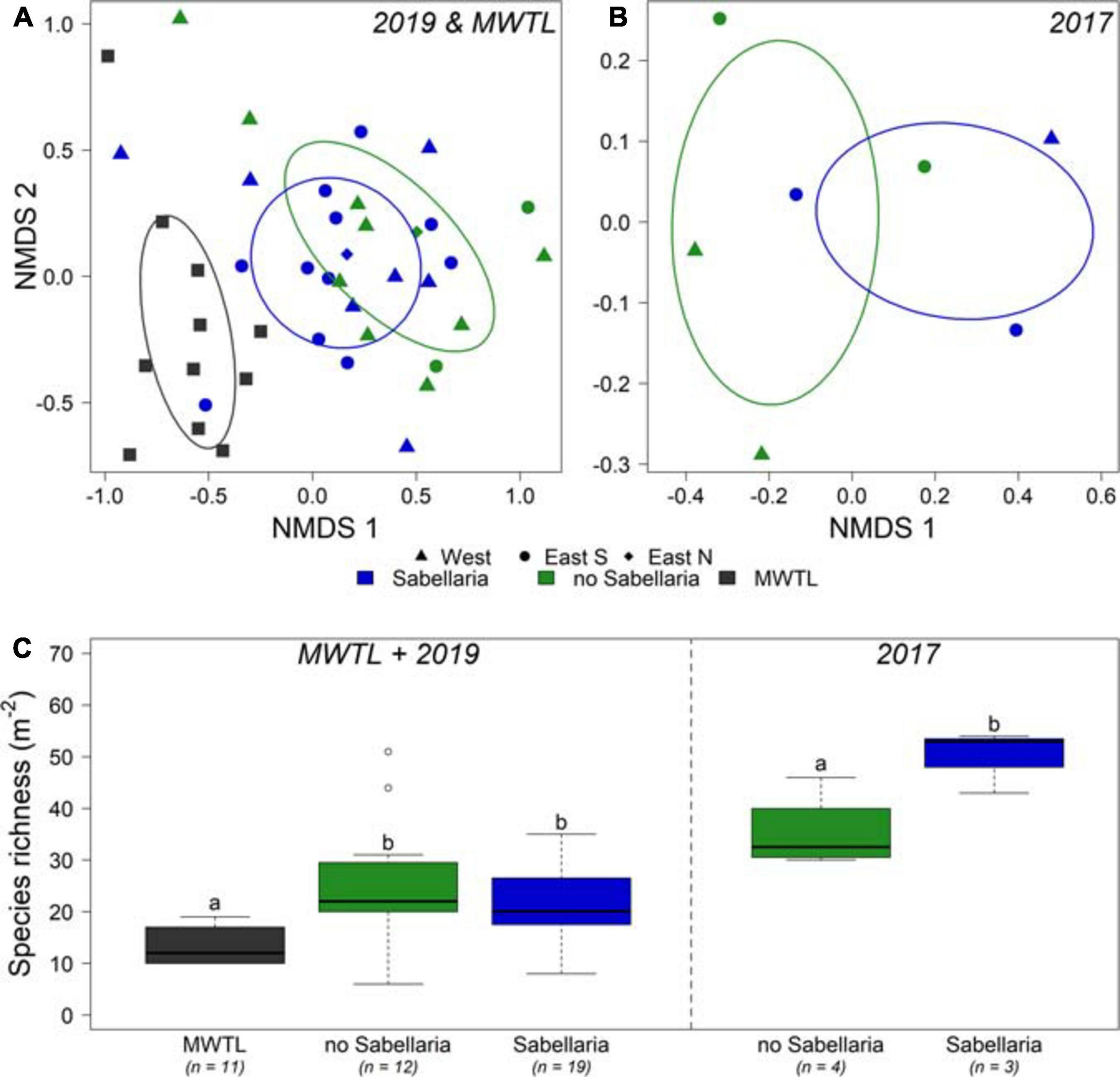 Comparison of endobenthos data between both research campaigns and the MWTL survey. (A) NMDS of endobenthos data gathered in the joint MWTL survey and the 2019 campaign, and for (B) the 2017 campaign. Samples with video-based observed Sabellaria habitat within a 50 m distance are blue; samples without Sabellaria habitat are green. Circles show the western trough, triangles the eastern trough south, and diamonds the eastern trough north. (C) species richness (Nm− 2) is shown per habitat for the MWTL survey and 2019 campaign combined, and separately for the 2017 campaign. n represents the number of boxcores included. Significant differences are represented by different letters. Note that the 2017 campaign data are analyzed separately from the MWTL survey and 2019 campaign data.
