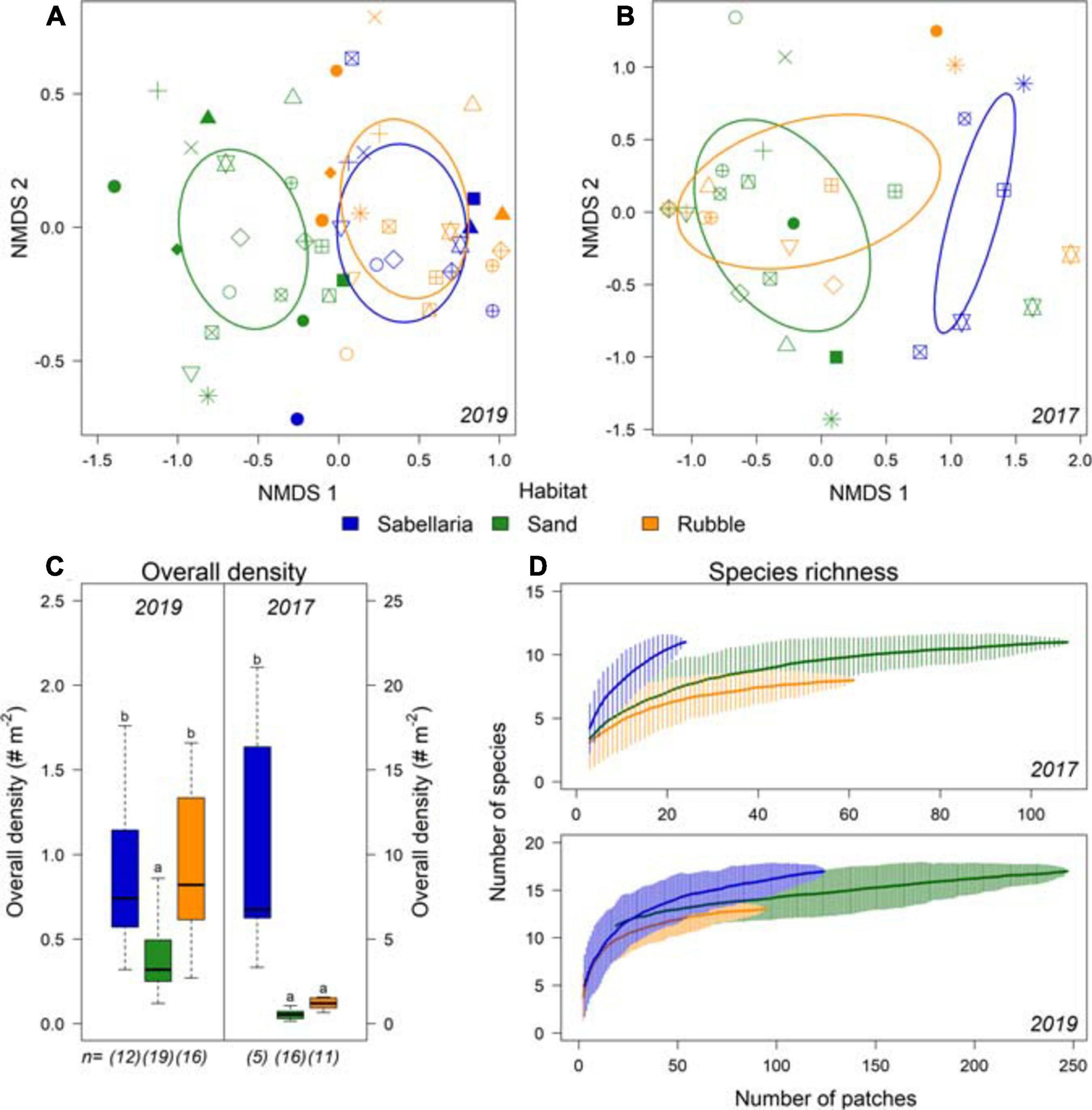 Differences in community composition between the different habitat types Sabellaria (blue), Sand (green), and Rubble (orange). (A) NMDS of epifauna data gathered in the 2019 campaign and (B) in the 2017 campaign. Each habitat type observed within a transect is displayed separately, with the different symbols representing the video transects. (C) overall density (# Nm− 2) and species richness (Nm− 2) per habitat type for 2019 and (D) for 2017. n represents the number of different transects with this habitat type. Significant differences are represented by different letters.