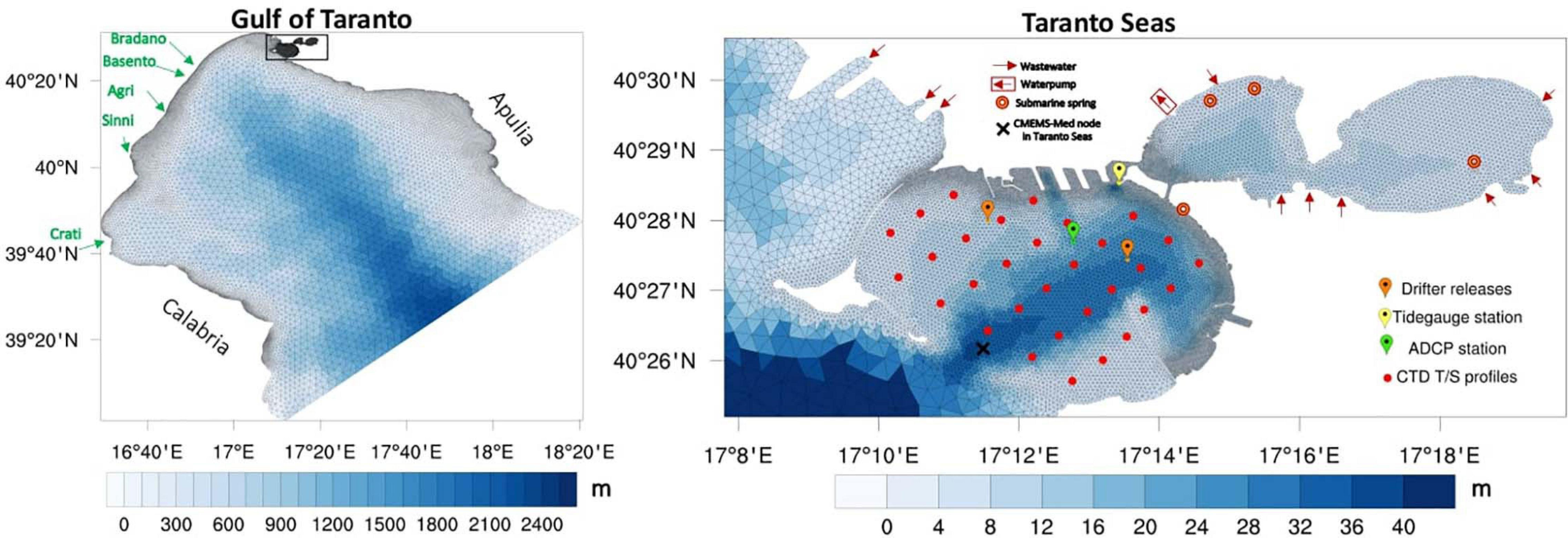 The Taranto Seas are a set of interlinked embayments, the larger of which covering a 7.5 km-wide elliptical embayment with dominant estuarine dynamics (De Pascalis et al., 2015), The larger embayment, called simply the Taranto Sea, is linked to the Taranto Gulf open sea and is an area of relatively intense tidal currents. Complex dynamics characterize the offshore areas of the Taranto Gulf, with basin-wide gyre reversals (Federico et al., 2020) that drive opposite current directions in the near-shore. Thus, a high resolution is required for the Taranto Sea while simultaneously keeping the connection with the open sea area currents. This is a typical downscaling problem and is particularly suitable for an unstructured grid model. The unstructured-grid component of the modeling platform SURF-U was implemented in the Gulf of Taranto (Figure 2, left panel) with higher resolution elements for the Taranto Seas (Figure 2, right panel). The downscaled currents interface with a Lagrangian drift modeling system (Jansen et al., 2016), designed for search-and-rescue support. The model results are compared with CTD, ADCP, tide-gauge data and drifter trajectories, collected in October 2014 during the Marine Rapid Environmental Assessment (MREA14) oceanographic survey (Pinardi et al., 2016).