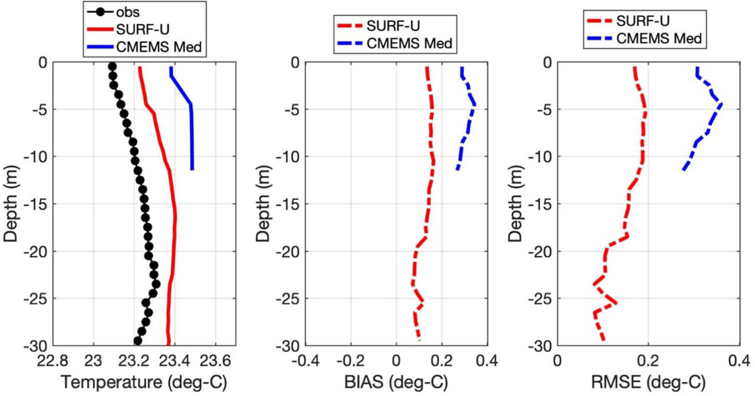 A 10-day simulation (27 September – 07 October 2014) was conducted using the SURF-U model described above for the Taranto Sea. The first 3 days of simulation are considered as the spin-up time necessary for the downscaled model to produce dynamically adjusted fields after initialization from the CMEMS model variables. Figure 3 shows the model comparison between SURF-U and CMEMS and the temperature CTD data collected during the MREA14 survey. The spatial distribution of the CTD profiles (red circles on the right panel of Figure 2) is very dense (spacing between the stations is less than 1 km), due to the need to sample the coastal and local scale features. The 31 CTD temperature casts have been averaged to produce a representative profile of the Taranto Sea, as reported in the left panel of Figure 3, together with the modeled profiles. SURF-U is close to the observed temperature profile, showing a significant improvement in terms of the coarse resolution CMEMS analyses, as represented by a single grid point located near the entrance of the Taranto Sea (see the black cross in the right panel of Figure 2). The improvement is evident in the BIAS profile (Figure 3, center panel), which is 0.13 C for SURF-U and is 0.3 C for CMEMS. For the RMSE profile (Figure 3, right panel) values of 0.15 C and 0.32 C are obtained for SURF-U and CMEMS, respectively.