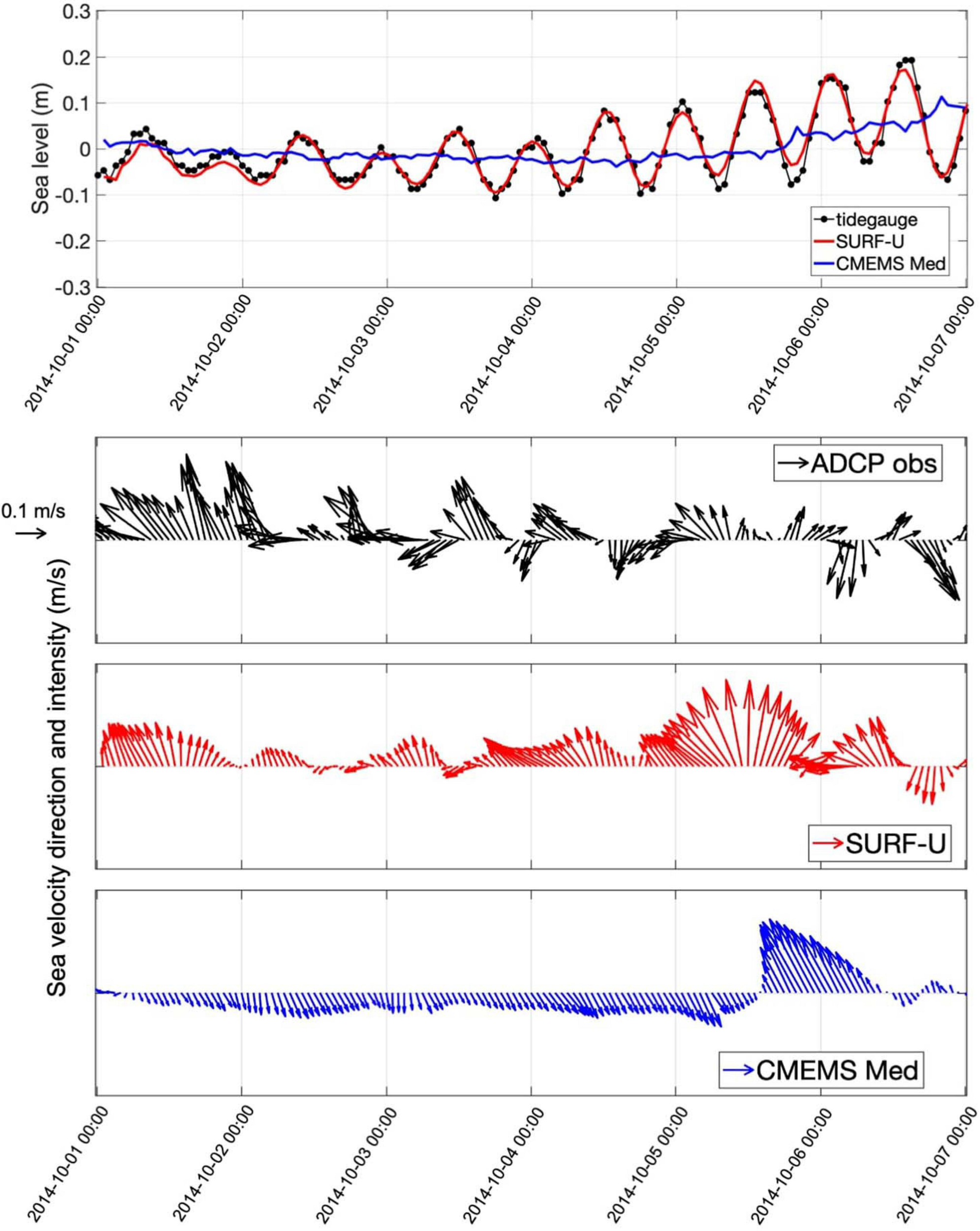 A comparison between modeled (SURF-U and CMEMS MED) and measured sea levels from tide-gauge (top panel). Time series of sea velocity direction and intensity, as measured by ADCP (black rows) and modeled by SURF-U (red rows) and by CMEMS Med (blue rows) (bottom panel) are given. The locations of the tide-gauge and ADCP stations are reported in Figure 2 right panel.
