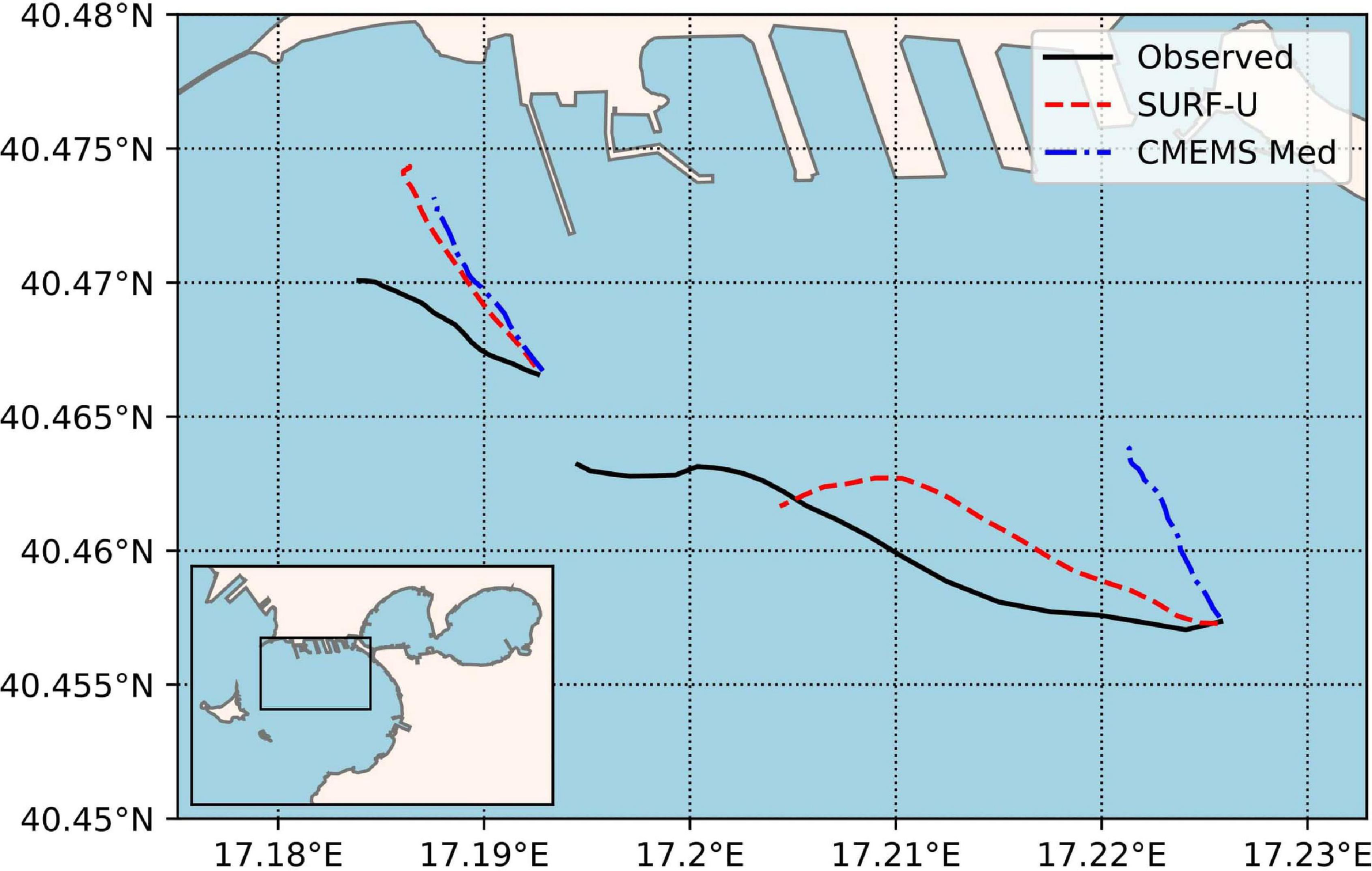 Figure 5 shows the mean trajectories of two groups of drifters released in the positions indicated in the right panel of Figure 2, for the first 12 h after their release (5 October 2014). The observed trajectory is shown in black and is compared to those simulated by the Lagrangian model using the SURF-U and CMEMS model data. The CMEMS data are derived from the single grid point outside the Taranto Sea (black cross on the right panel of Figure 2), chosen ad hoc for the simulation. For the eastern group of drifters, the SURF-U trajectory shows a significant improvement, while for the western group the SURF-U and CMEMS drifts are equivalent. This could be due to limitations in our modeling hypothesis, such as the low spatial/temporal variability of wind forcing and the neglected effects of Stokes drift. However, the inherent limited predictability of objects floating at sea can only be ameliorated by ensemble methods (Vieira et al., 2020).