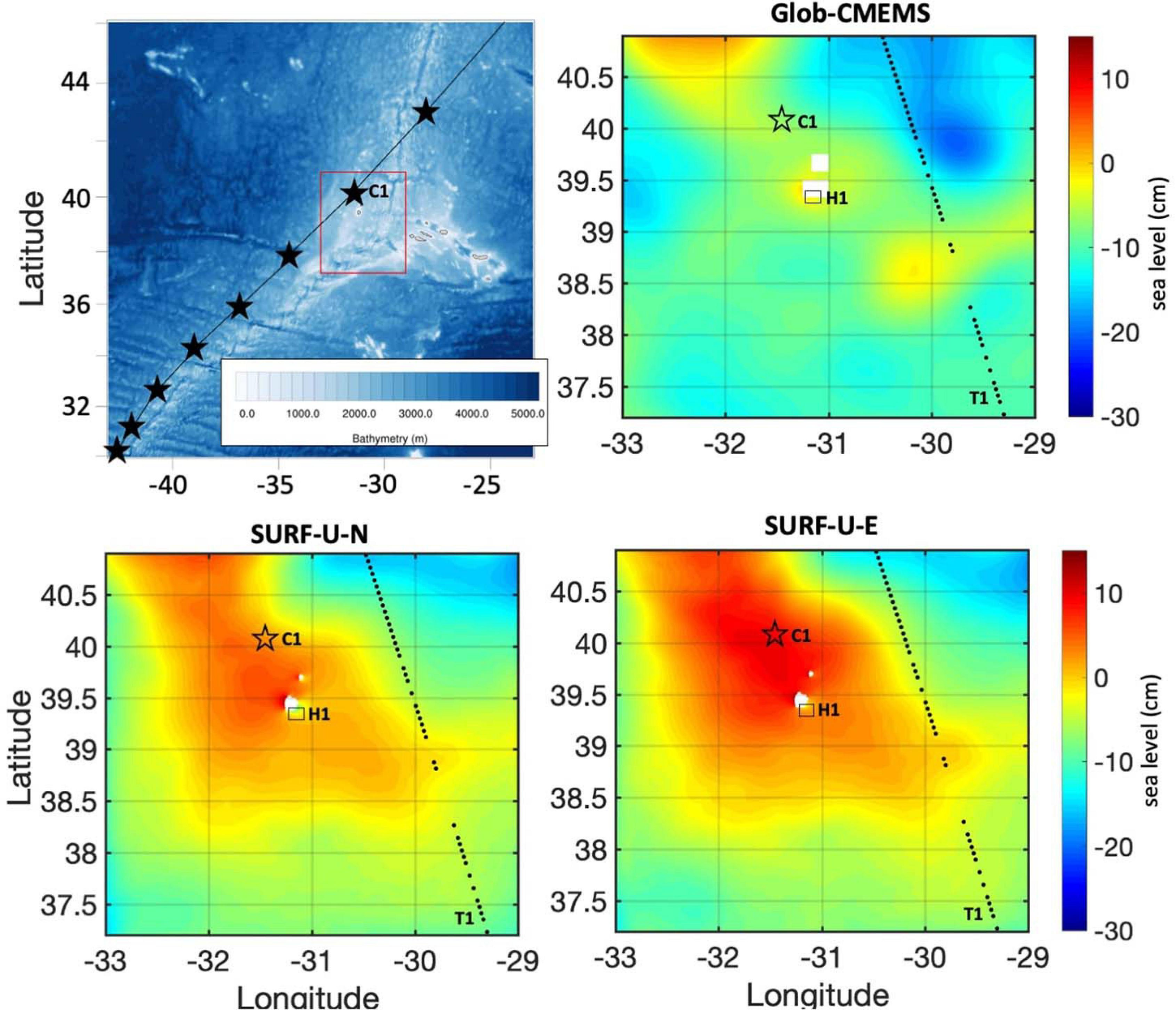 Comparison between the satellite absolute dynamic topography and the sea surface height from the CMEMS and the two SURF-U models (top panel). The time series of the sea level for Glob-CMEMS, SURF-U-N, and SURF-U-E close to the commercial port of Lajes in Flores (bottom panel) are shown.