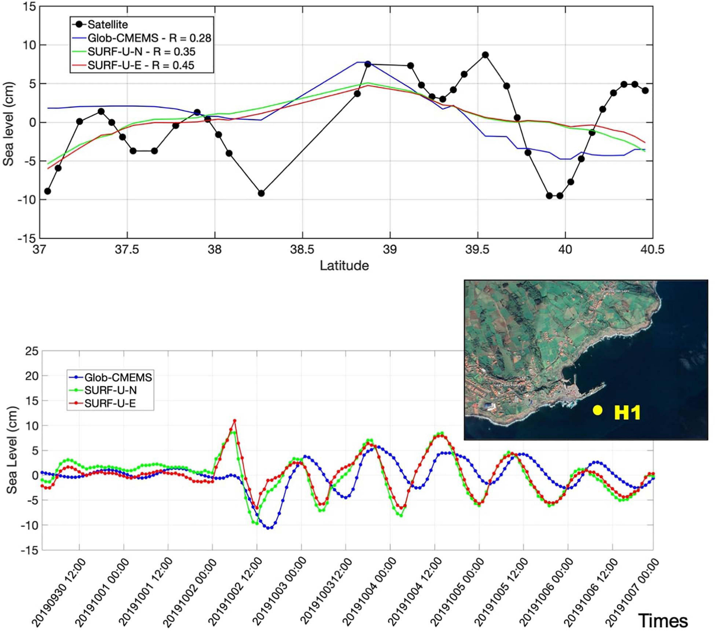 Figure 7 shows the storm surge at the coastal scale near the commercial port of Lajes in Flores (H1 box in Figure 7), where extensive damage and the total destruction of the port were reported by Zelinsky (2019) in this period. The time series of SURF-U show a local increase of sea level from 01:00 am on 2 October, with a maximum peak at 06:00 am. This feature is not present in CMEMS sea level. Since CMEMS and SURF-U were forced by the same atmospheric field (ECMWF), we argue that this difference is due to the higher resolution of the coastal model and to the different wind stress parametrizations in the two models. SURF-U-E indicates a higher surge (12 cm) than SURF-U-N (8 cm) at the peak event. The patterns of the three models after the hurricane impact are similar, with a large decrease immediately after the passage, then sea level oscillation and adjustment, until reaching normal conditions. This feature has previously been reported by several authors (Ezer, 2019).