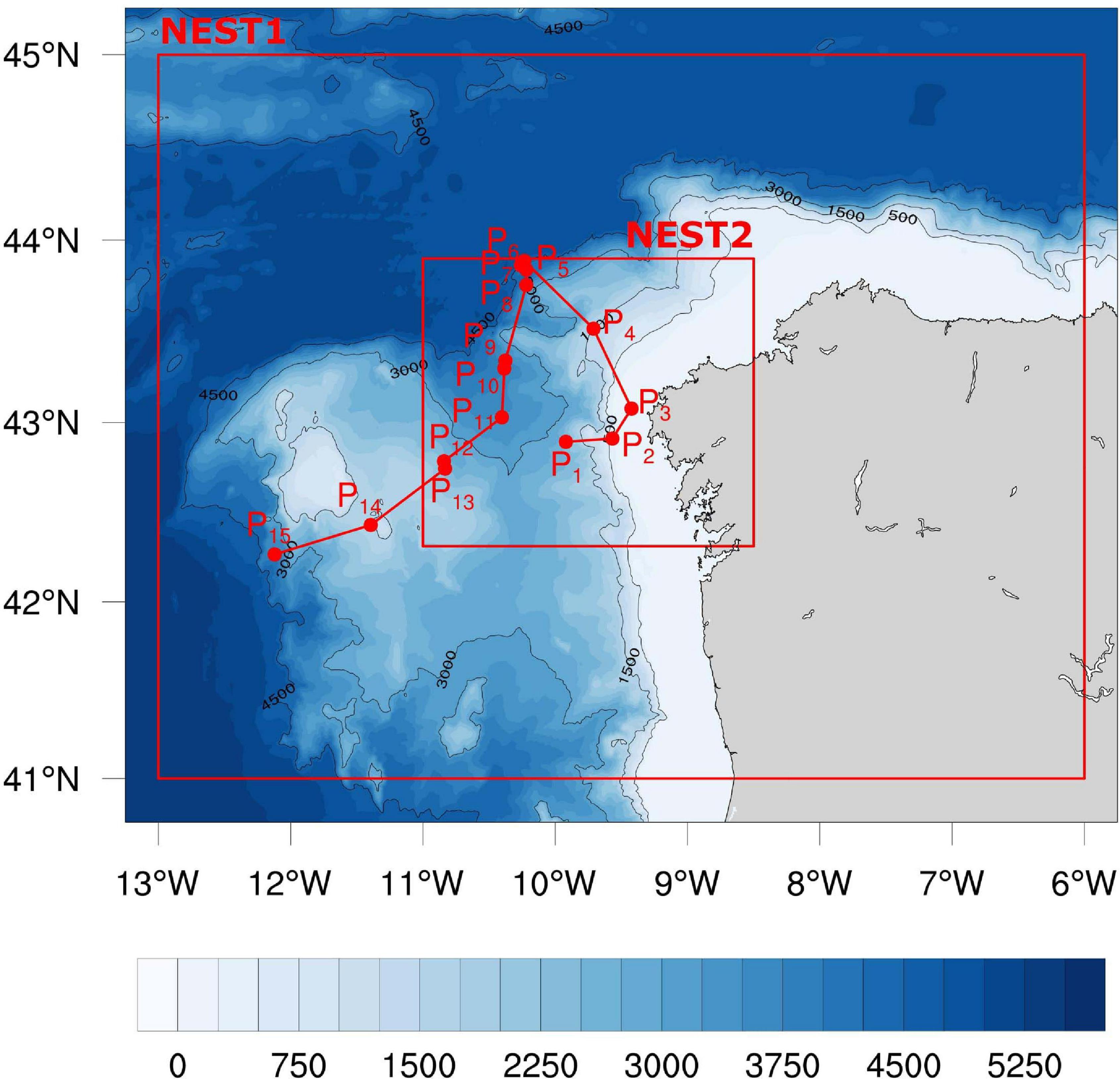 A double nested model experiment was conducted (NEST1 and NEST2). Appendix Table A4 summarizes the values for the model input parameters chosen for this experiment. For each nesting, the grid spacing was decreased by a factor of 4. In this case we used CMEMS reanalysis fields (IBI_REANALYSIS_PHYS_005_002 products) because no analyses were available for such period. The starting CMEMS fields are at 1/12° horizontal resolution. The NEST1 model domain covered an area of approximately 552 km in longitude by 447 km in latitude, extending from 13.0° W to 6.0° W and from 41.0° N to 45.0° N, with a resolution of 1/48° (∼1638 × 2316 m). The NEST2 domain extended approximately 200 × 177 km from 11.0° W to 8.5° W and from 42.312° N to 43.9° N, with a resolution of 1/192° (∼417 m × 579 m).