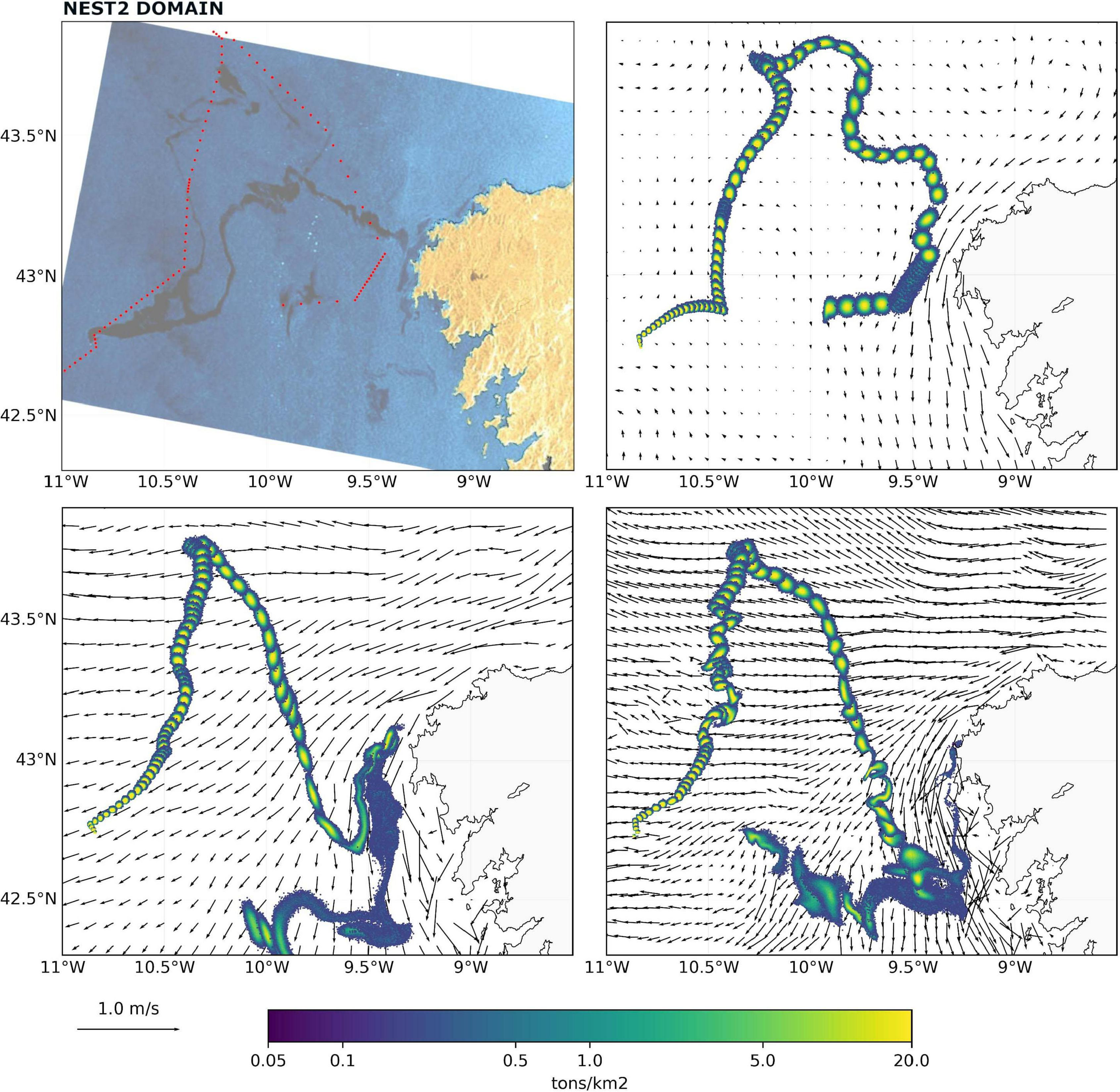 ESA Satellite image of 17 November at 10:45 (top-left panel) showing the wake of fuel oil in black. Red dots indicate the location of the release points assumed. Simulated drift of a continuous leak of fuel oil along the trajectory taken by the Prestige from 13 November at 15:00 to 17 November at 11:00 forced by 3 different model CMEMS (top-right panel), NEST1 (bottom-left panel), and NEST2 (bottom-right panel) with increasing grid resolutions of 8000, 2000, and 500 m. Black arrows, whose length is proportional to velocity, denote the direction and strength of the ocean currents. Arrows are subsampling every 1 (CMEMS), 4 (NEST1), and 10 (NEST2) grid points.
