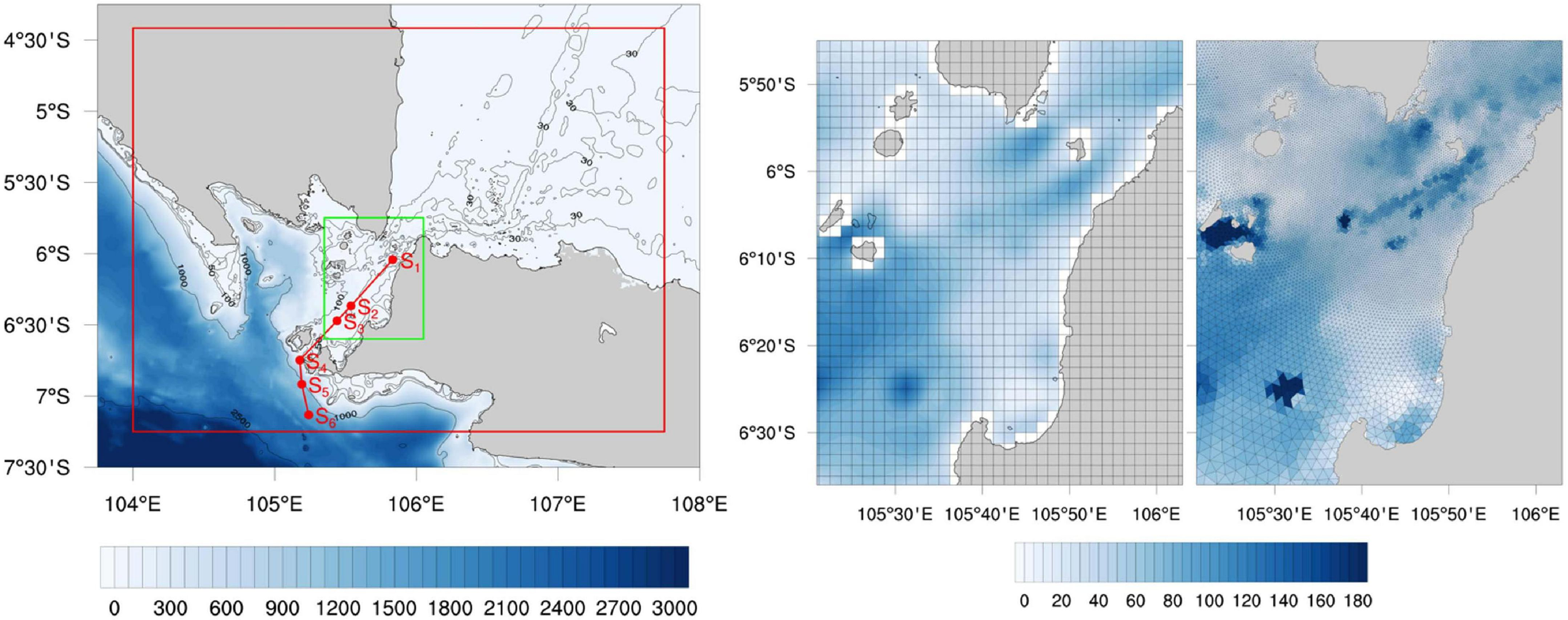 Left panel: Bathymetry contour map of the Sunda Strait experiment area as obtained from GEBCO datasets at a 30 Arc seconds resolution. Red rectangles delineate the boundaries of the nested domains. Red dots indicate the location of the ship-mounted ADCP station from 5AM (S1) to 11AM (S6). The green box highlights the subdomain region, where we zoom to highlight the structured and unstructured grid features (right panels). Right panels: Horizontal grids for the subdomain region implemented by the structured (left panel) and unstructured (right panel) grid SURF models. The resolution of the structured grid corresponds to about 2 km, while the unstructured grid resolution ranges from 100 m near the coast up to 3 km in the open sea.