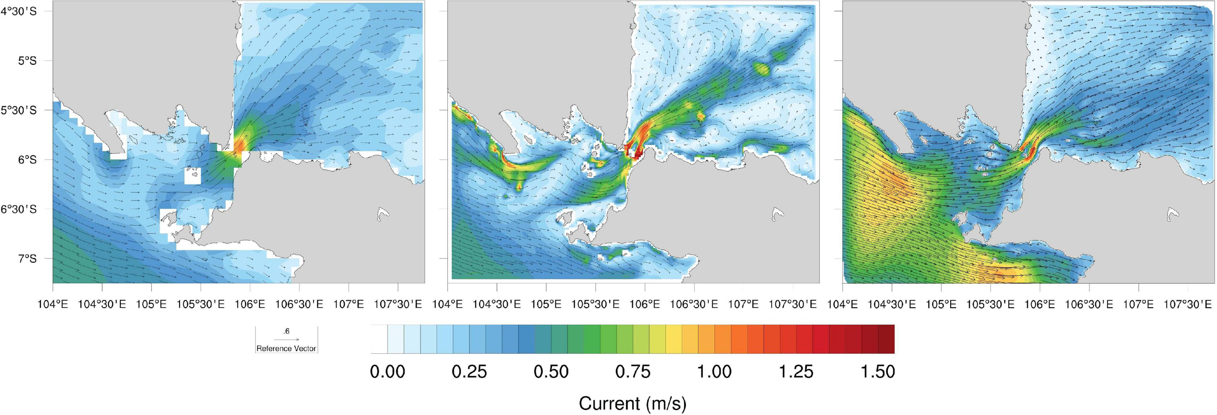 The Sunda Strait lies between the Indonesian islands of Java (to the south-east) and Sumatra (to the north-west) and connects the Java Sea (Pacific Ocean) to the Indian Ocean (south) (Figure 10, left panel). The Strait has a width of 24 km and the depth ranges from 20 m to 90 m, with the shallow part near the small Sangiang Island located in the middle part of the strait, as shown in the left panel of Figure 10. The Sunda Strait is considered to be a water area with one of the highest ship traffic densities in the world, serving both national and international shipping. Knowledge of the characteristics of the ocean currents in this Strait is essential for the safe navigation, planning, and development of the nearby coastal areas.
