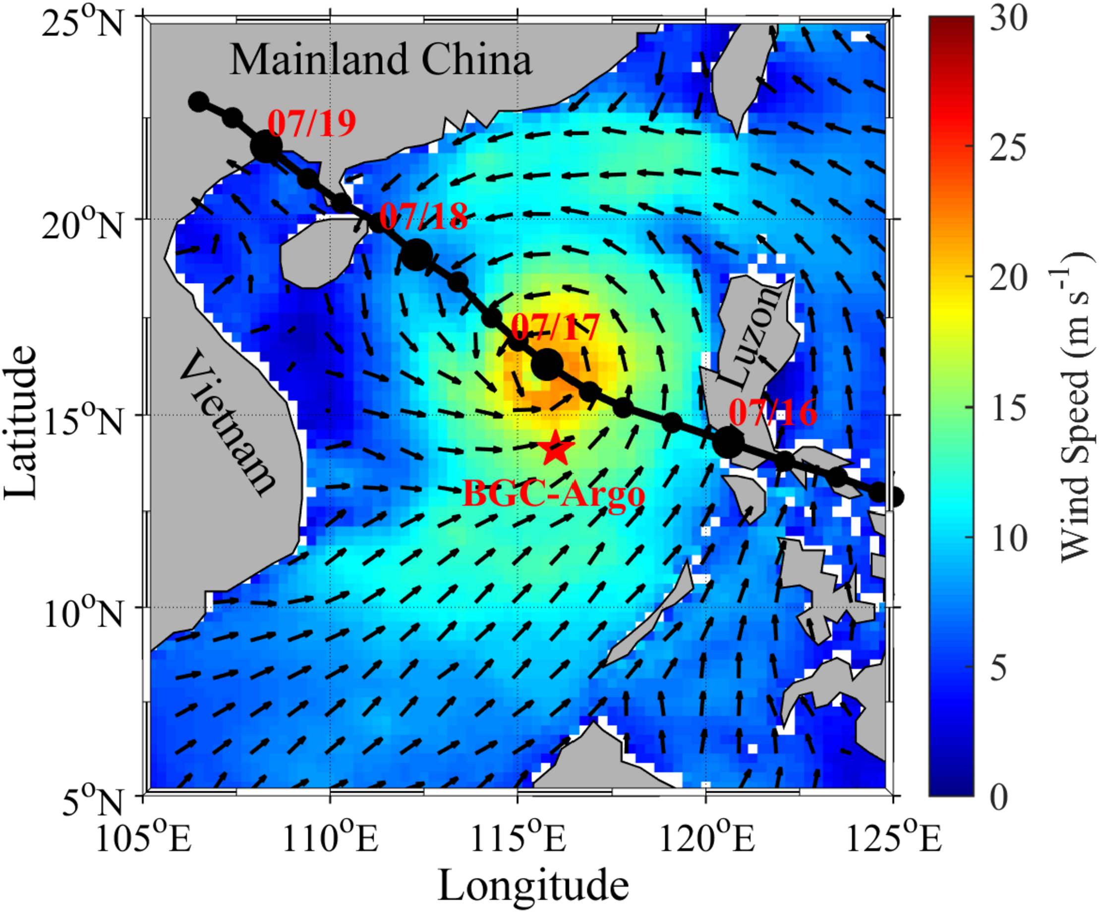 Wind speed at 0 h UTC on July 17 in the SCS and the track of Rammasun (black line). The black dots represent the 6-hourly typhoon centers, and the red pentagram shows the BGC-Argo float.