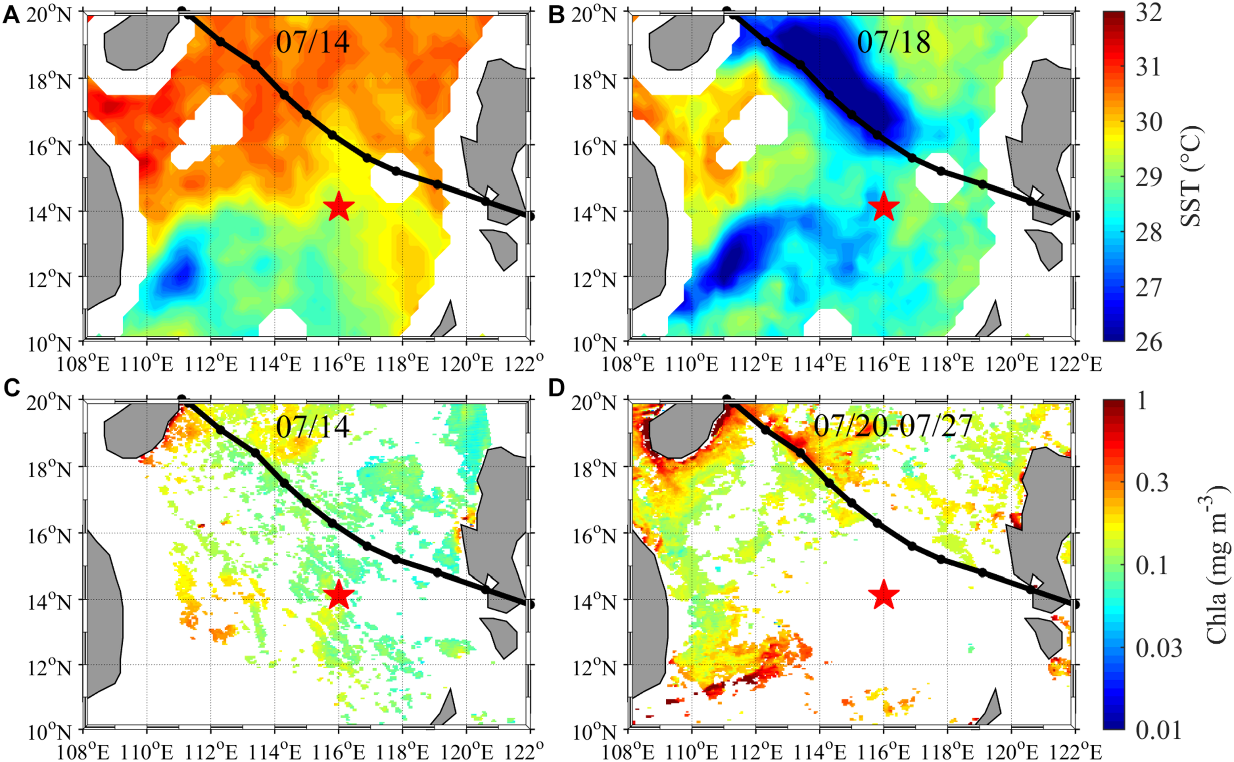Satellite-observed SST on (A) July 14 and (B) July 18, and surface Chla on (C) July 14 and (D) composited for July 20–27.