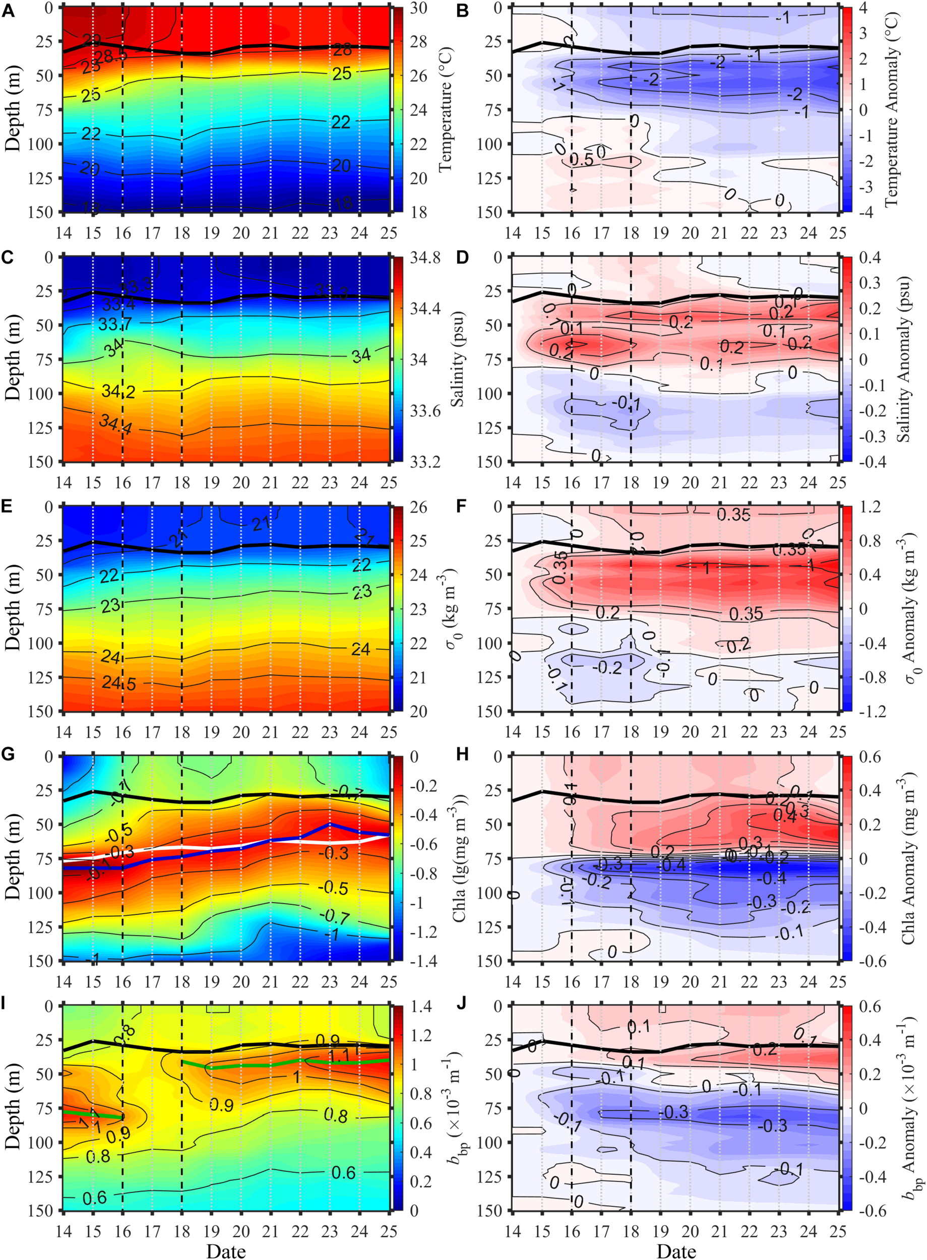 Time series of vertical distributions of float-observed (A) temperature, (C) salinity, (E)σ0, (G) Chla, and (I)bbp, alongside their corresponding anomalies (right panel). The solid black lines in (A-J), white line in (G), blue line in (G), and green line in (I) represent the MLD, depth of isopycnic of σ0 = 23 kg m– 3, depth of DCM, and depth of DBM, respectively.