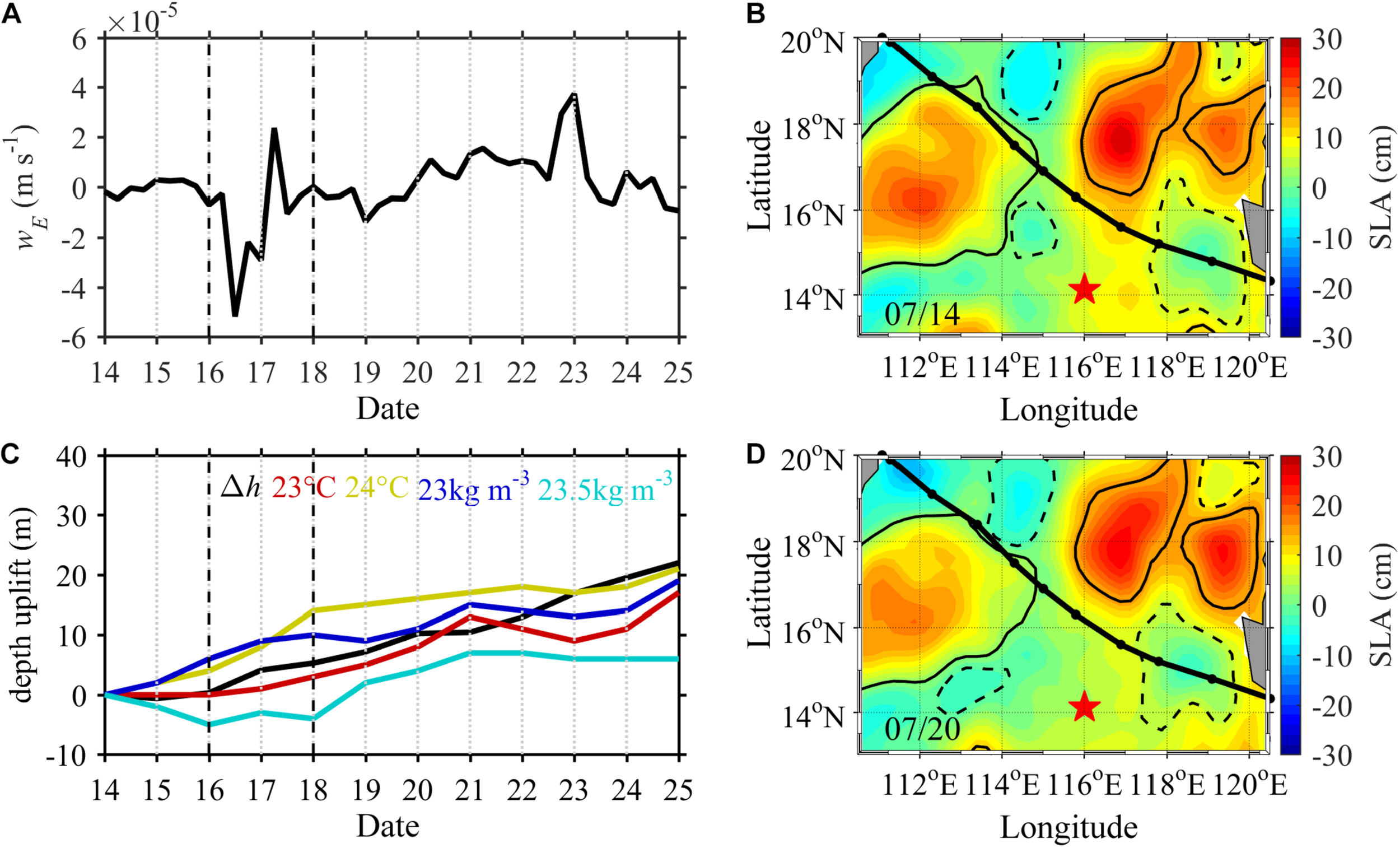 (A) Time series of Ekman pumping at the float location. (B,D) Daily SLA on July 14 and 20, with solid (dashed) contours for the edges of anticyclonic (cyclonic) eddies. (C) Estimated vertical displacement of the thermocline (Δh), the float-observed depth of the 23 (24) °C isotherm, and depth of isopycnic of σ0 = 23 (23.5) kg m– 3.