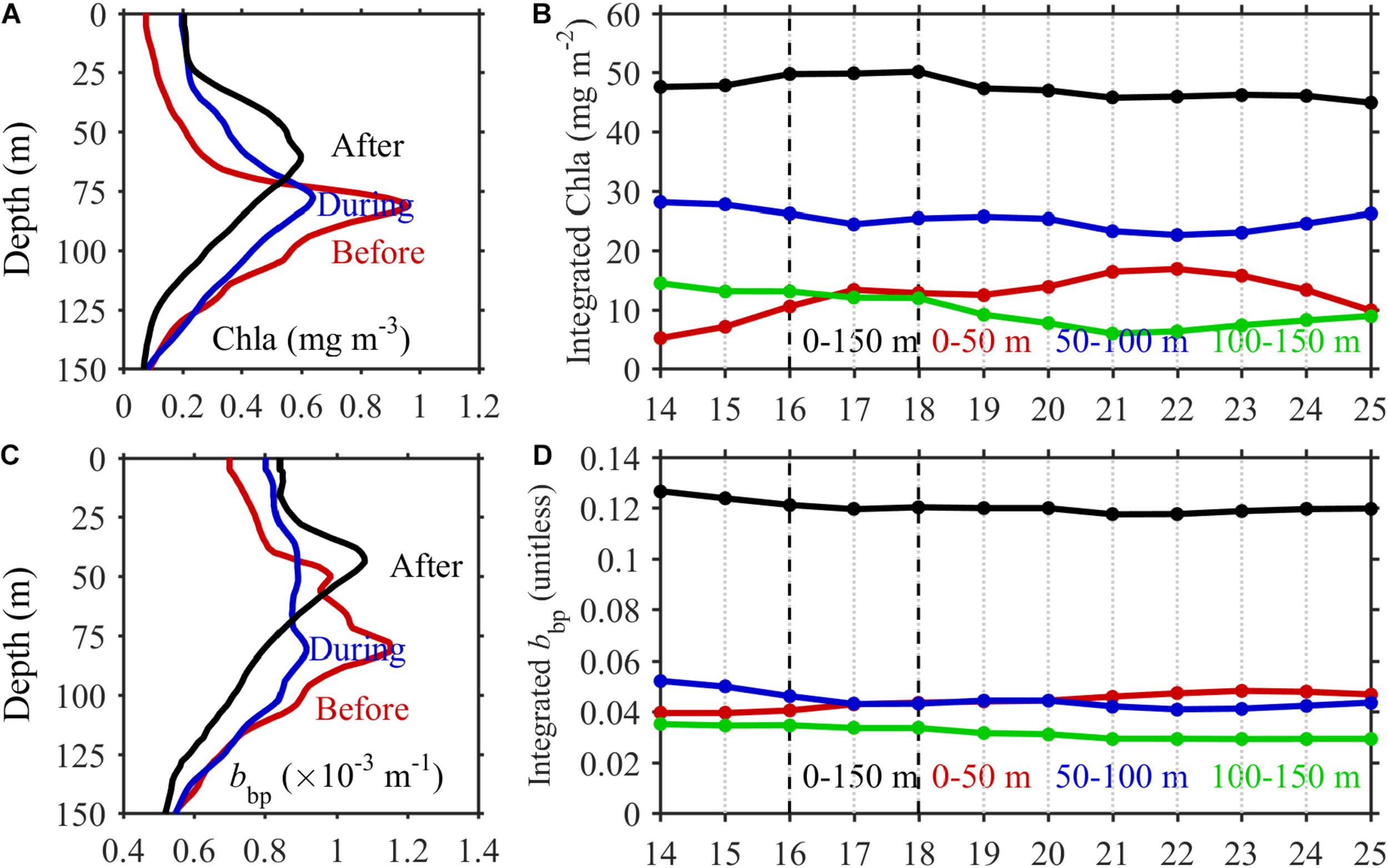 (A,C) Vertical distributions of the time-averaged Chla and bbp before (July 14–15), during (July 16–17), and after (July 19–23) the typhoon’s passage. (B,D) Time series of the depth-integrated Chla and bbp in the upper (0–50 m), intermediate (50–100 m), and lower layers (100–150 m), and the entire column (0–150 m), respectively.