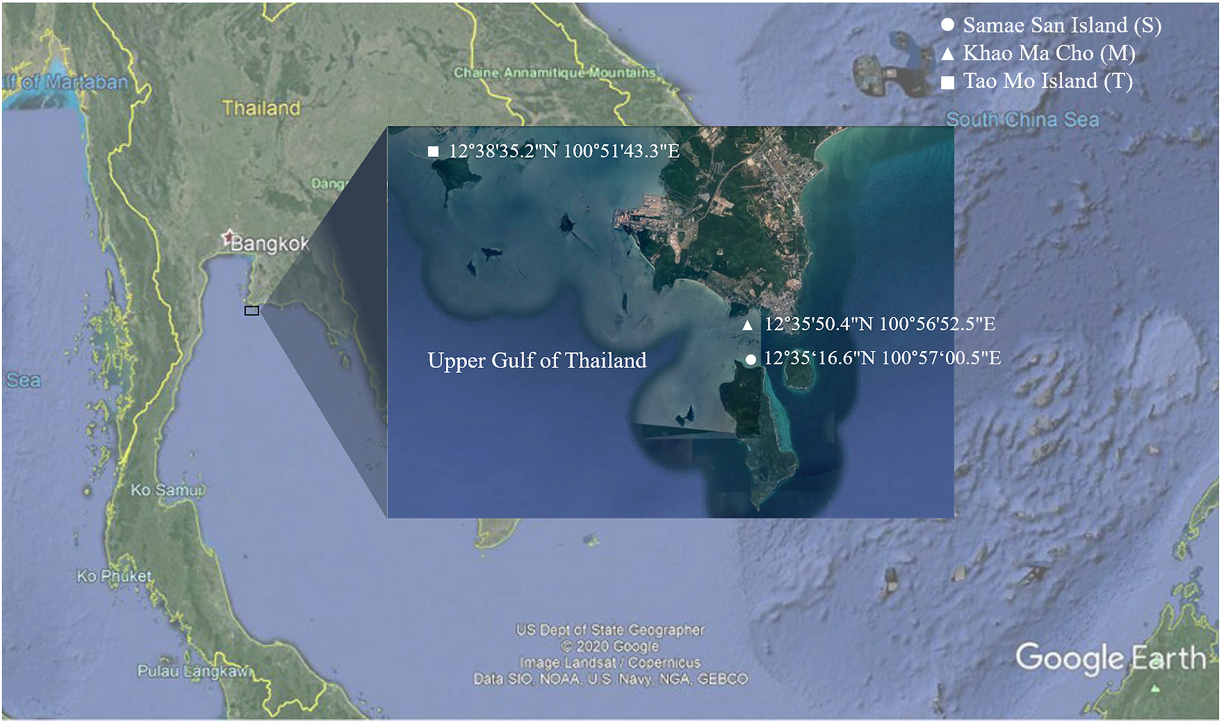 Map representing sampling sites of Samae San Island, Khao Ma Cho, and Tao Mo Island, in the upper Gulf of Thailand.