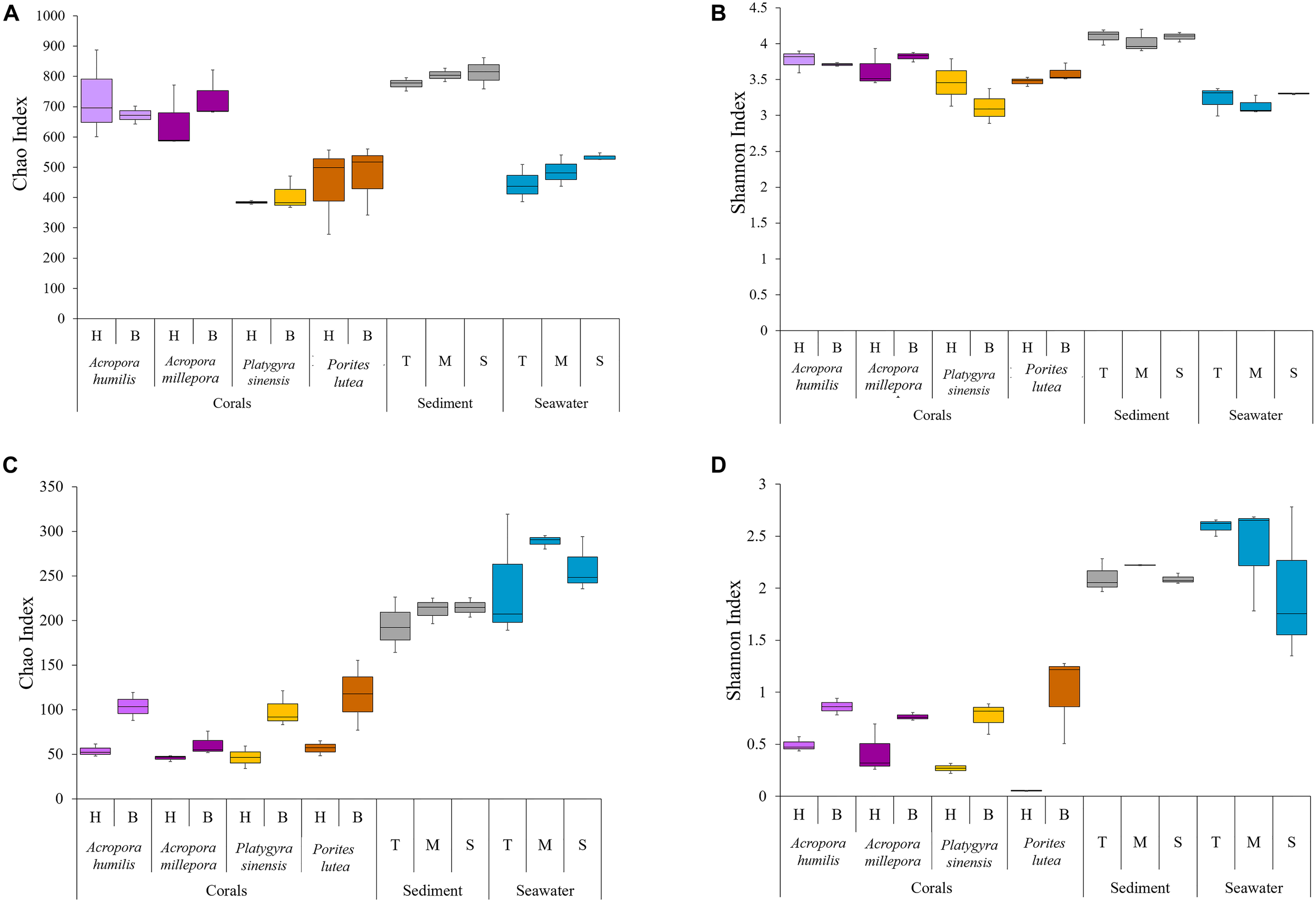 The greatest relative prokaryotic OTU richness (Chao index) was observed in sediment samples, followed by corals, and seawater represented the least OTU richness. Statistical tests demonstrated significant differences in the prokaryotic OTU diversity between the sediments and the other sample types (ANOSIM: P < 0.01). OTU richness varied among coral species: two Acropora had relatively greater prokaryotic diversity than Porites and Platygyra (Figure 2A: avg. Chao index of A. humilis was 705.63 ± 109.85, A. millepora 689.19 ± 94.85, P. sinensis 397.72 ± 42.0, and P. lutea 458.96 ± 119.44). Significant differences were determined between A. humilis vs. P. sinensis (t-test: P = 0.0002), A. humilis vs. P. lutea (P = 0.003), A. millepora vs. P. sinensis (P < 0.001), and A. millepora vs. P. lutea (P = 0.0021). Nonetheless, OTU evenness (Shannon indices) was found to be relatively similar among samples. No significant differences in Shannon indices were observed between the sediments (avg. 4.08 ± 0.11) and the other samples (3.45 ± 0.33) (P > 0.01), highlighting an evenness of individual distributions of the prokaryotic OTUs in each sample (Figure 2B: avg. Shannon index 3.28).