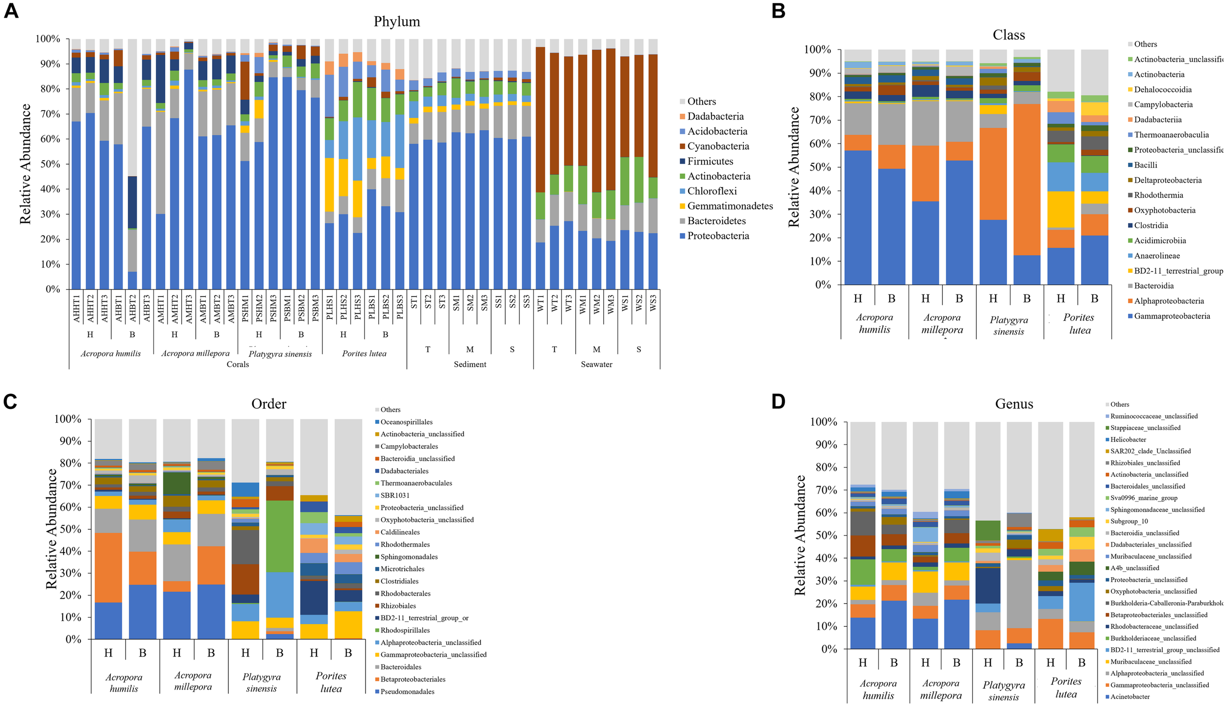 Prokaryotic diversity was analyzed in detail by class, order, and species compositions, between bleached and healthy conditions, and across coral species (Figures 3B–D). Bacterial orders Rhizobiales and Rhodobacterales were found shared across all coral species and were among the top 20 most abundant in all cases, suggesting their important functions in corals. The prokaryotic compositions showed more variation between coral genera than the variations observed between healthy vs. bleached conditions. For example, relatively high percentages of class Alphaproteobacteria were found in P. sinensis (Figure 3B: healthy 39.01% and bleached 64.26%). Differences in diversity between healthy and bleached corals were observed, but these differences were non-statistically significant when analysis was conducted at the genus level (Figure 3D): A. humillis (ANOSIM: P = 0.21, R = 0.26), A. millepora (P = 0.20, R = 0.11), P. sinensis (P = 0.10, R = 0.96), and P. lutea (P = 0.10, R = 0.89). In addition, some classes that were reported in both healthy and bleached corals were found to be populated by different genera: for example, predominant Alphaproteobacteria in P. sinensis contained different genera between healthy and bleached conditions. Bleached Acropora species exhibited heightened proportions of bacterial genera Acinetobacter and Helicobacter. For bleached P. sinensis, Actinobacter and unclassified genera of class Alphaproteobacteria, class Oxyphotobacteria, and order Rhizobiales were instead found to increase, whereas unclassified genera of family Stappiaceae, family Rhodobacteriaceae, and class Gammaproteobacteria decreased. For bleached P. lutea, unclassified genera of BD2-11 terrestrial group, A4b, order Dadabacteriales, and bacteria of subgroup10 were found to increase, whereas unclassified genera of class Gammaproteobacteria, phylum Proteobacteria, class Oxyphotobacteria, class Bacteroidia, and SAR202 clade decreased.