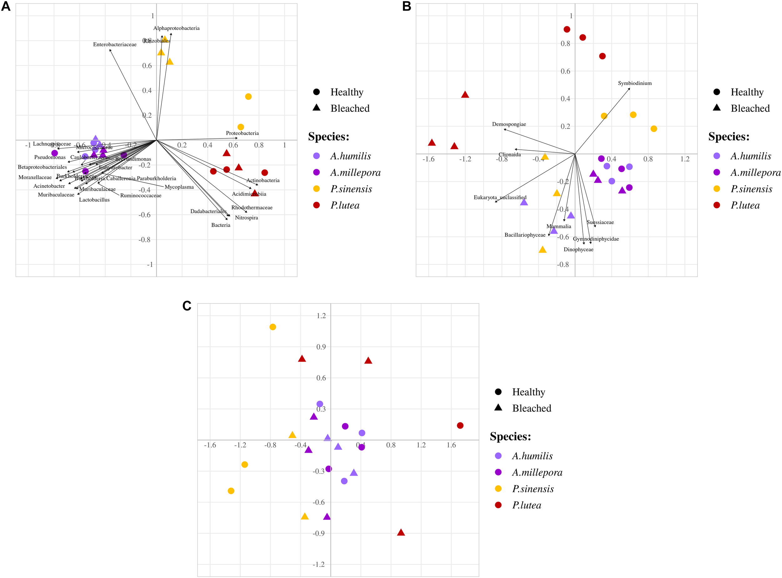 Analyzing the microbial community of bleached coral clusters showed that the bleached eukaryotic microbe cluster had rather community structure disparity from the healthy eukaryotic microbe cluster, especially for bleached P. lutea (Figure 4). Relatively higher frequencies of Symbiodinium showed positive correlation with healthy coral eukaryotic communities (Figure 5B). The correlation analysis also revealed that Demospongiae and Clionaida were statistically responsible for the separation of bleached from healthy corals, in particular, P. lutea (Figure 5B). Bacillariophyceae, Suessiaceae, Dinophyceae, and Gymnodiniphycidae were responsible for the correlation in the other bleached coral samples (Figures 4A, 5C).