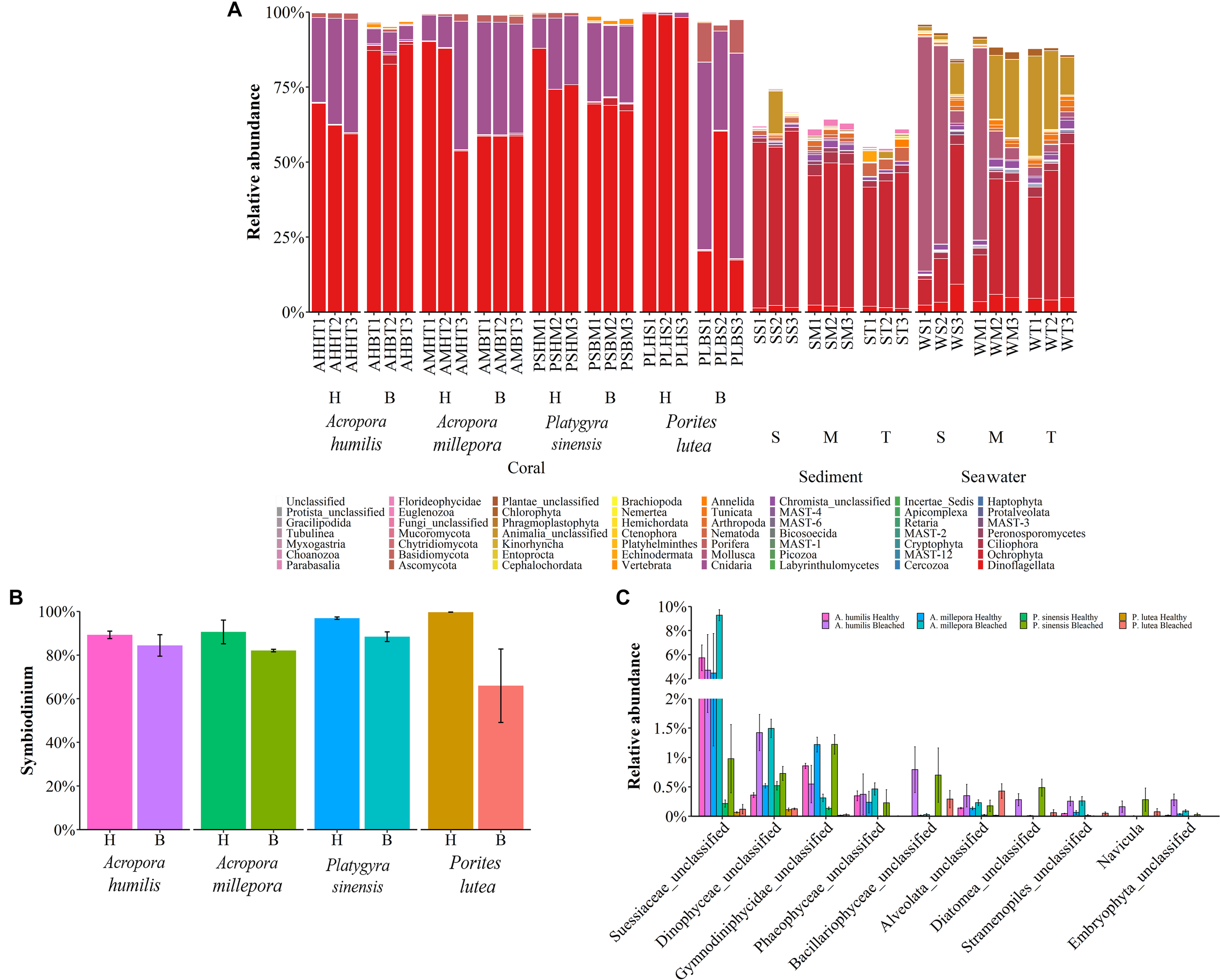 Percent relative abundance of (A) eukaryotic phyla across corals, sediments, and seawater; (B)Symbiodinium; and (C) simple eukaryotic Chromista and Protista across coral species.