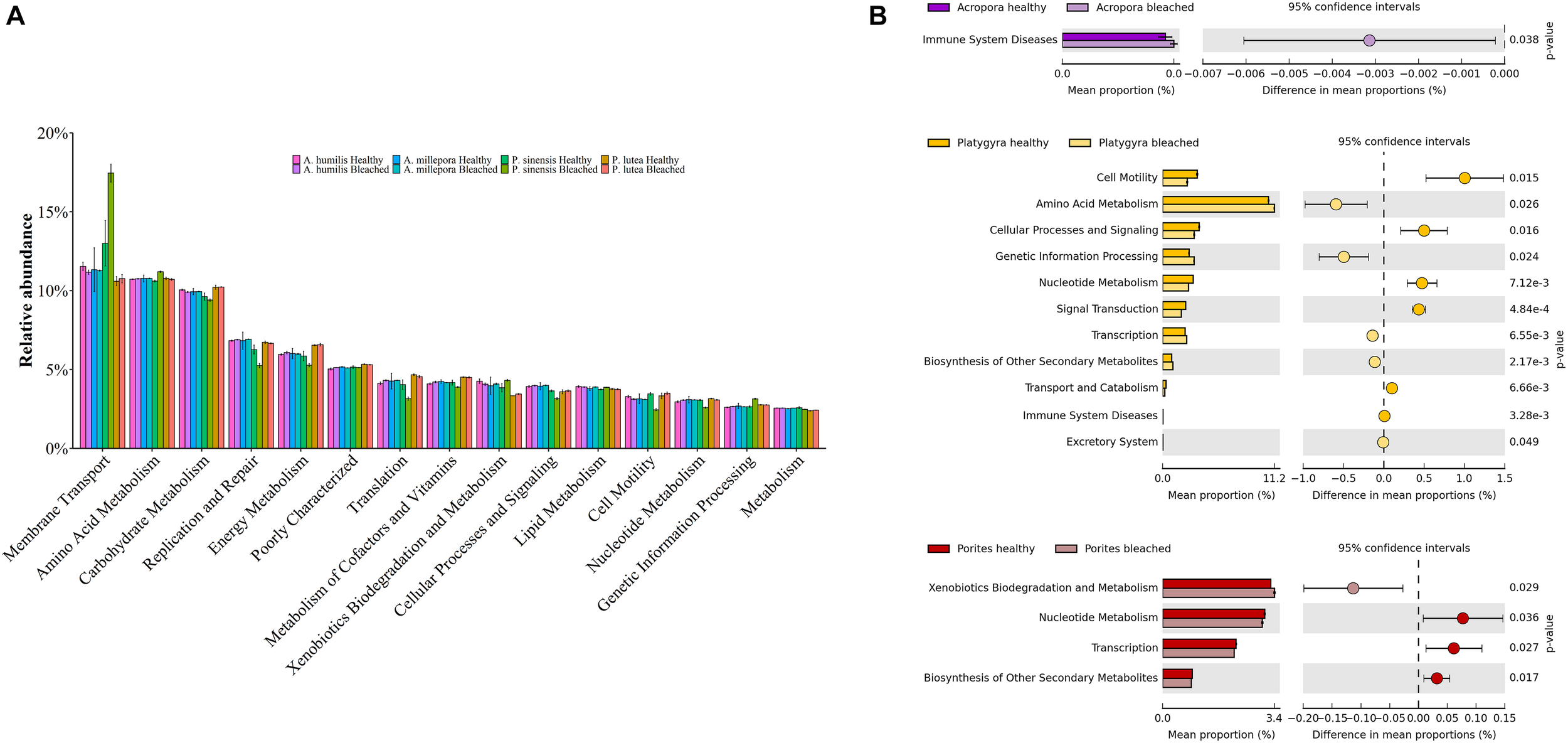 Functional potentials of (A) healthy and bleached coral-associated prokaryotic communities and (B) corresponding prokaryotic community pairs between healthy and bleached coral genera.