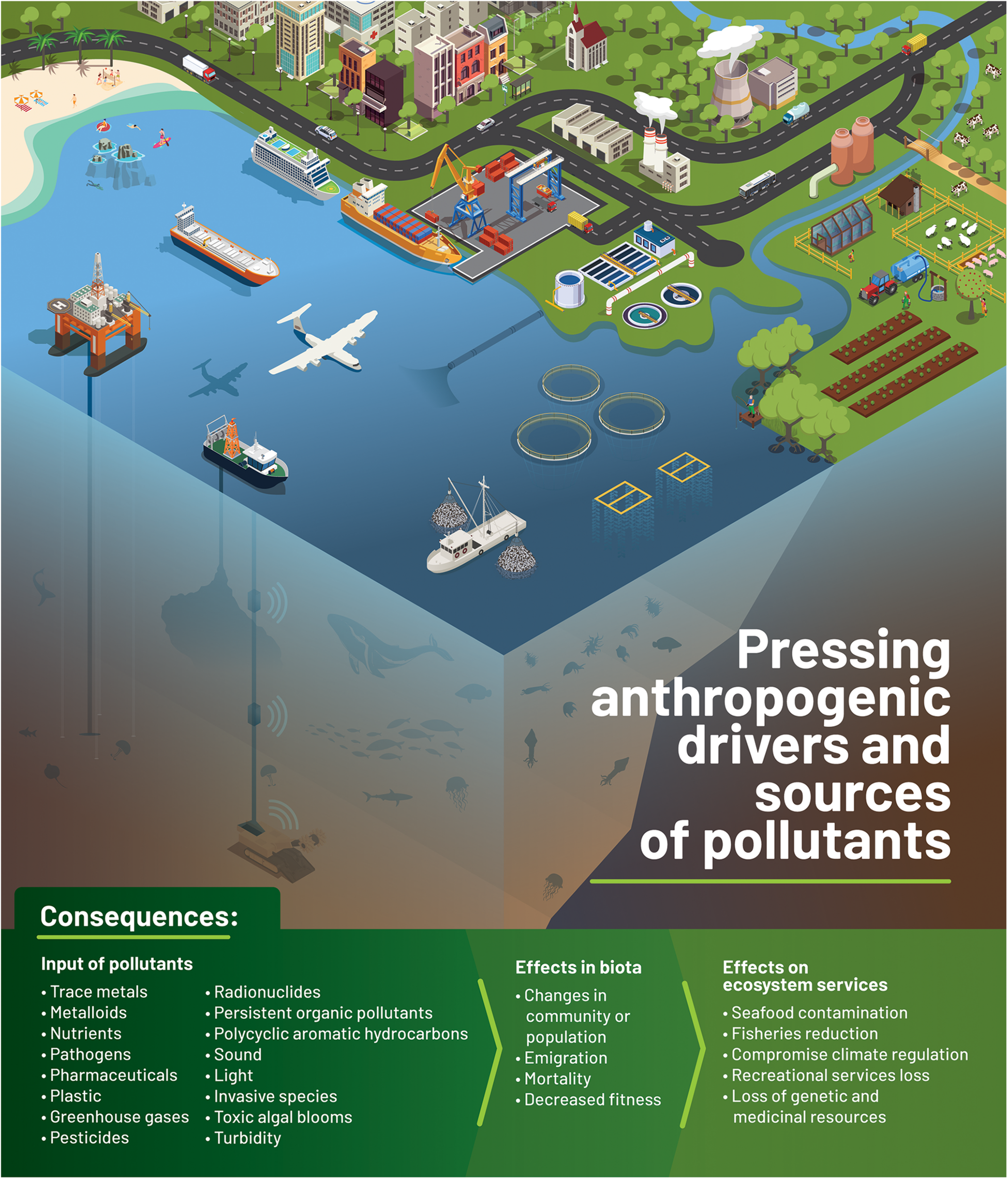 Globally, the ocean is being treated as a waste sink, mostly due to human erroneous propensity to view dilution as the solution to pollution (Knowlton, 2004). While high-income countries treat ∼70% of the municipal and industrial wastewater, in low-income countries only 8% undergoes any treatment, which leads to an estimation that over 80% of all wastewater is globally discharged without any treatment (WWAP, 2017) and may end up in the ocean. Human developments in terms of agriculture, industries, and technologies have been at the price of degrading the marine environments, especially near land-based sources. In that sense, trace metals (e.g., lead – Pb, zinc – Pb, copper – Cu, and mercury – Hg) are used in many industrial processes that, inappropriately discarded, have led to contamination of the coastal and open ocean ecosystems. Similarly, the development of the organic chemistry promoted the synthesis of a diverse group of new substances including plasticizers, pesticides, brominated and organophosphate flame retardants, among others. Many of those substances and their by-products have proved to have a wide range of hazardous side effects. For instance, the resultant contaminant toxicity (e.g., methyl mercury; persistent organic pollutants), microbial pollution (e.g., cholera and antimicrobial resistance), and natural toxins (e.g., from HABs) can cause illness and death by exposure through seafood consumption or via contact with seawater (Depledge and Bird, 2009; Weihe et al., 2016; Bell et al., 2017; Miranda et al., 2021). Integrated impacts of pollutants may be further exacerbated by negative feedback loops, like microplastics carrying pathogenic bacteria, antimicrobial resistance genes, and endocrine−disrupting chemicals entering the food web (Fleming et al., 2019).