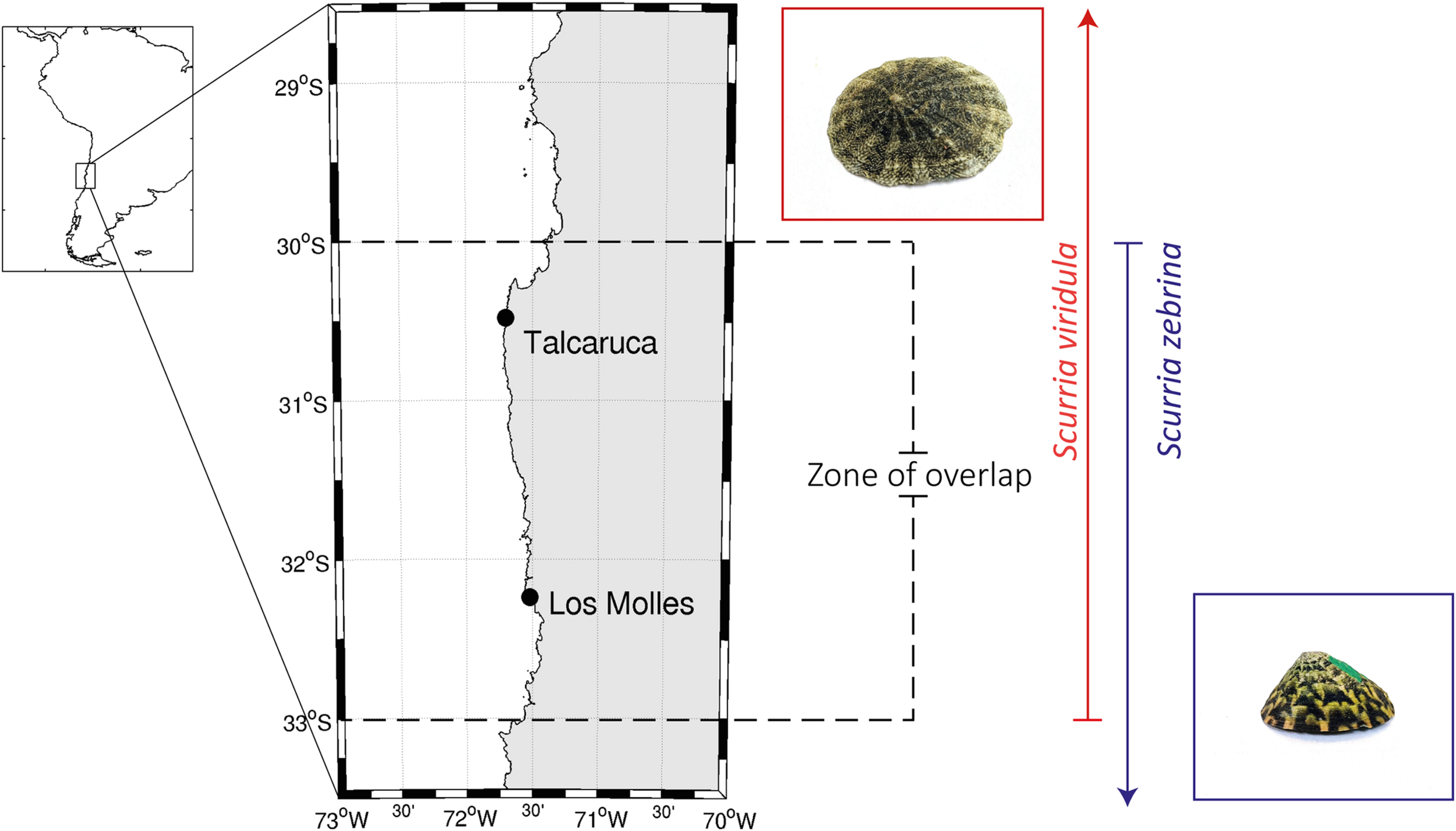 Location of the study sites localized near the upwelling center Punta Lengua de Vaca around 30°S on the Chilean coast. Map of the study sites (Talcaruca and Los Molles) in north-central Chile and their relation to the South America map. The distribution of both species is that reported in Aguilera et al. (2020), and it is indicated here with a red (Scurria viridula) or blue (S. zebrina) arrow. The distribution overlap zone for both species is marked with dashed lines. A representative photograph of both species also shows S. viridula in a red square and S. zebrina in a blue one.