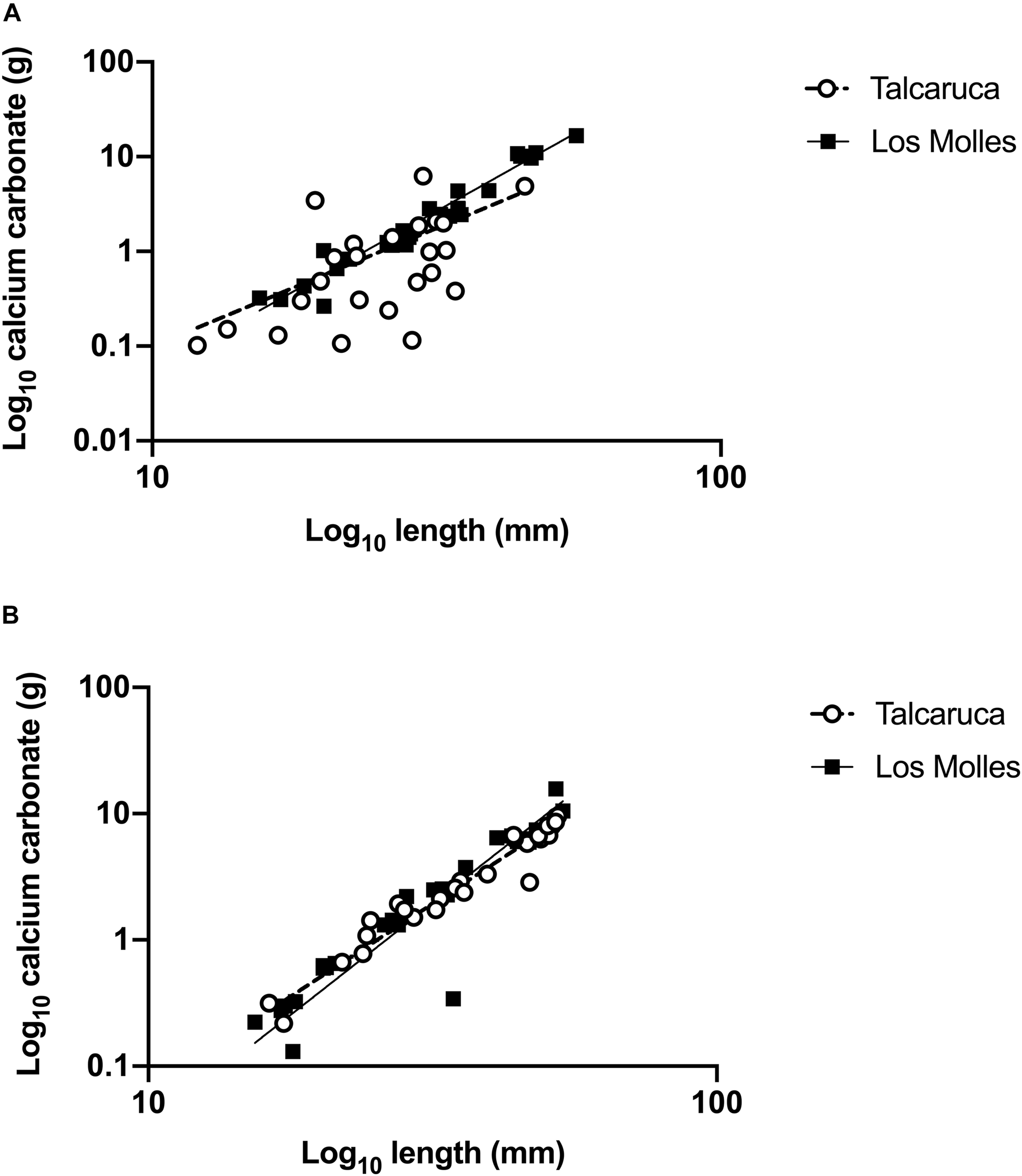 Carbonate content in populations of two congeneric Scurria species. Simple linear regressions (lines) of length and calcium carbonate (Log10 transformed) in S. zebrina(A) and S. viridula(B) from two different localities, Talcaruca (empty circle), and Los Molles (black square). Each dot represents one organism.
