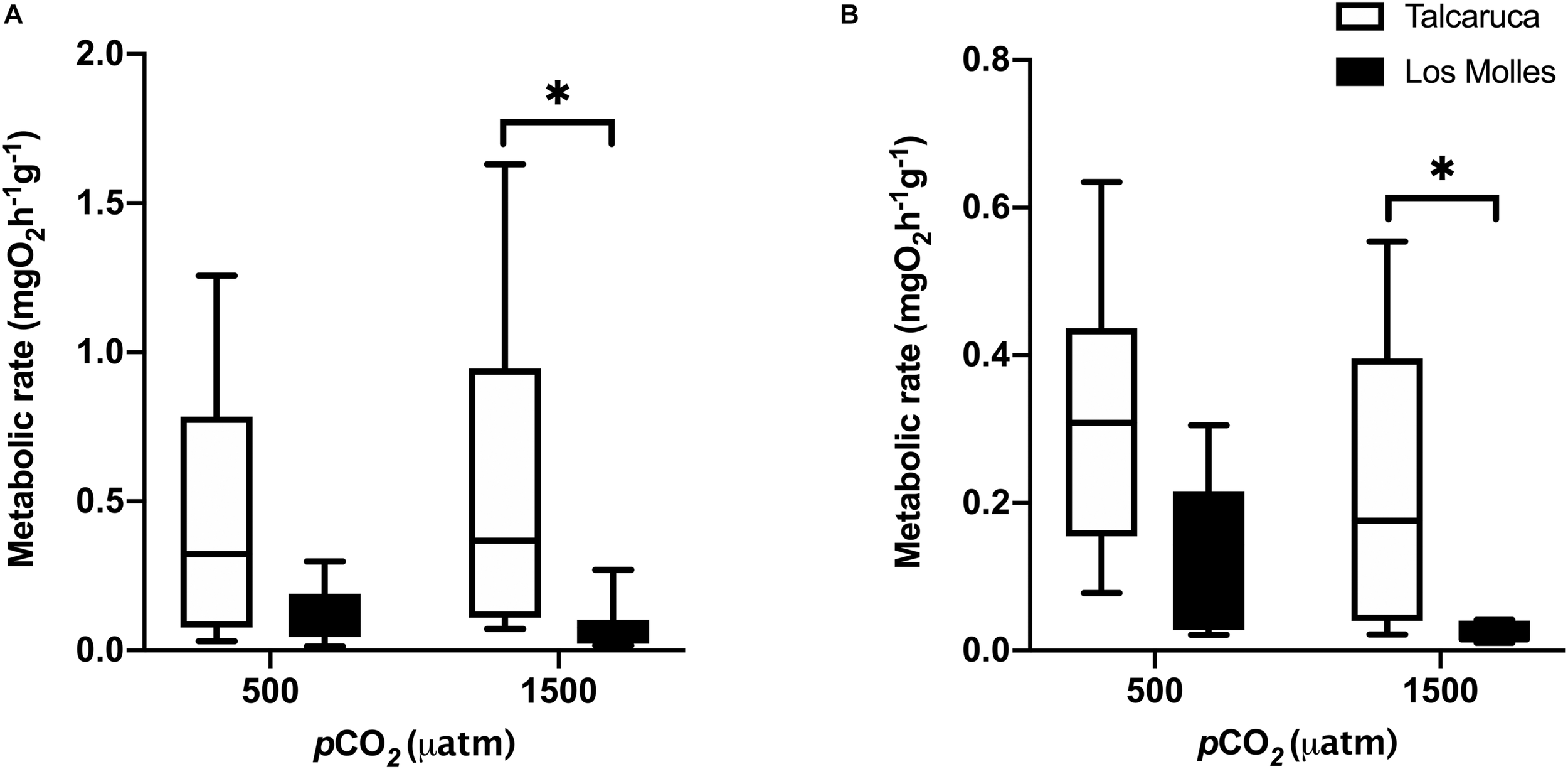 pCO2 effects on the metabolic rate of two different Scurria species. Box and whiskers plot representing the metabolic rate of S. zebrina(A) and S. viridula(B) under 500 or 1500 μatm of CO2. Data from Talcaruca is presented in white and from Los Molles in black. The boxes represent the interquartile range, while the inner line indicates the median value, and the vertical lines represent the maximum and minimum values. Asterisks represent statistical differences (Two-way ANOVA and Sidak multiple comparison test, p < 0.01).