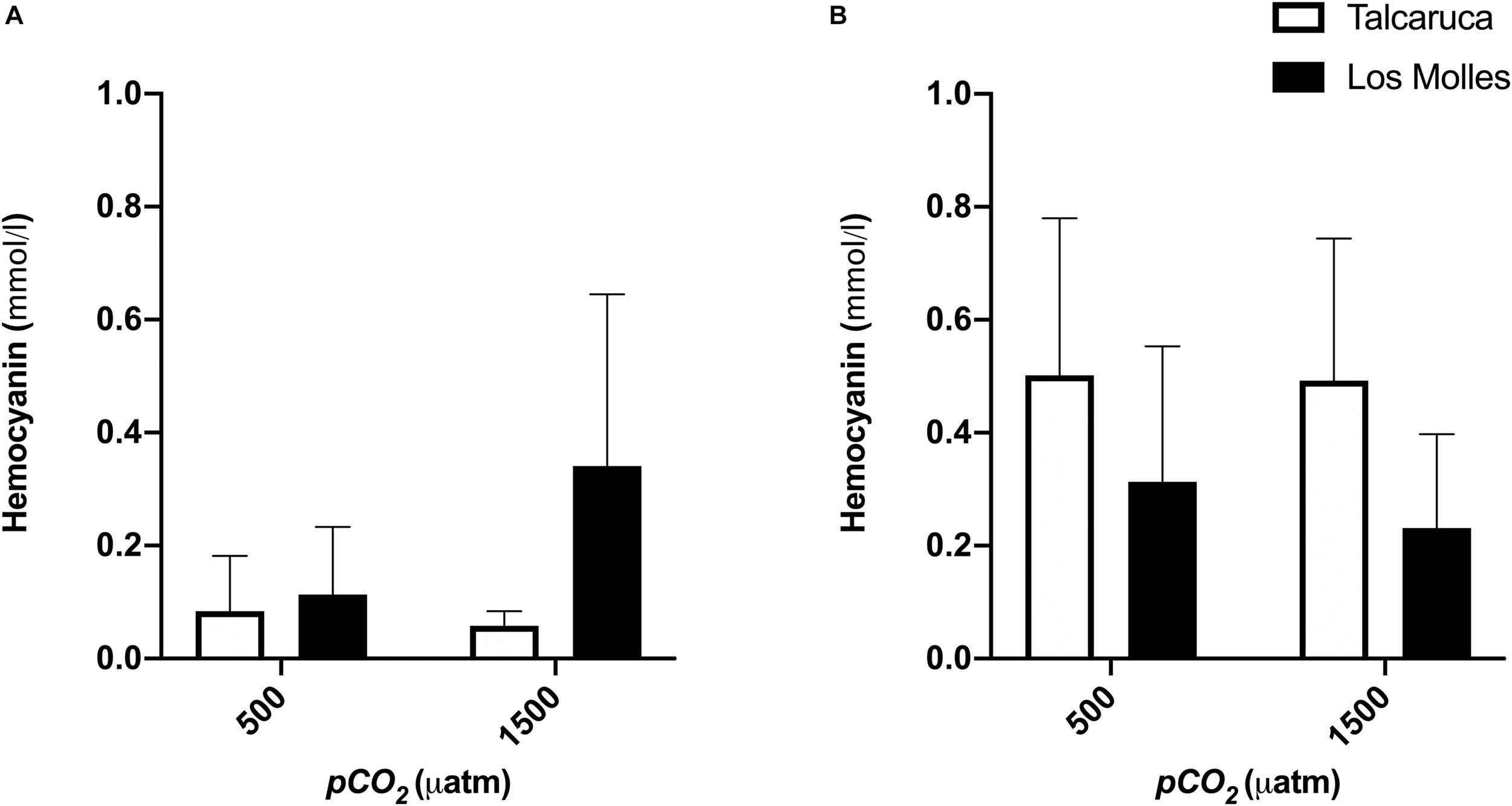 Hemocyanins in the hemolymph of marine invertebrates are functional analogs of the hemoglobin present in vertebrates and exhibit cooperativity in their oxygen-binding properties and allosteric regulation to efficiently uptake and deliver oxygen under physiological conditions (Taylor et al., 1995; Birk et al., 2018). The results obtained showed no significant differences in the hemocyanin content among treatments. Despite this, it is important to note that S. viridula individuals from Talcaruca could produce a higher concentration of hemocyanin at higher levels of pCO2, compared to those from Los Molles (see Figure 6B), which is consistent with the levels of oxygen consumption recorded during the experiment (Figure 3B).