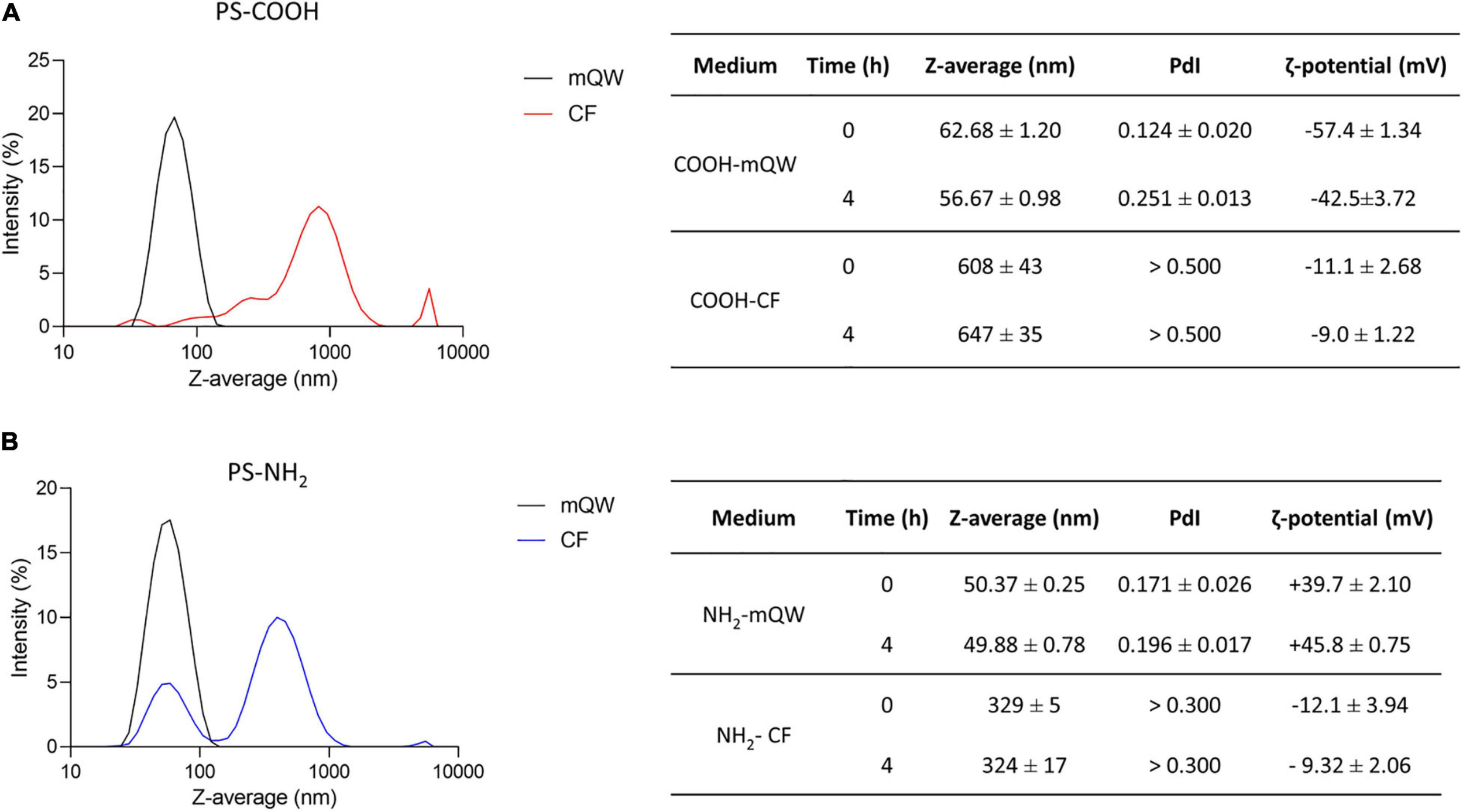 Polystyrene nanoparticles behavior in exposure media. Particles size distribution and Z-average (nm), polydispersity index (PdI) and ζ-potential (mV) of unlabeled PS-COOH (A) and PS-NH2(B) in mQW and coelomic fluid (CF) at time 0 and 4 h. Data are referred to 25 μg mL–1 of PS NPs and reported as mean ± SD (n = 3).