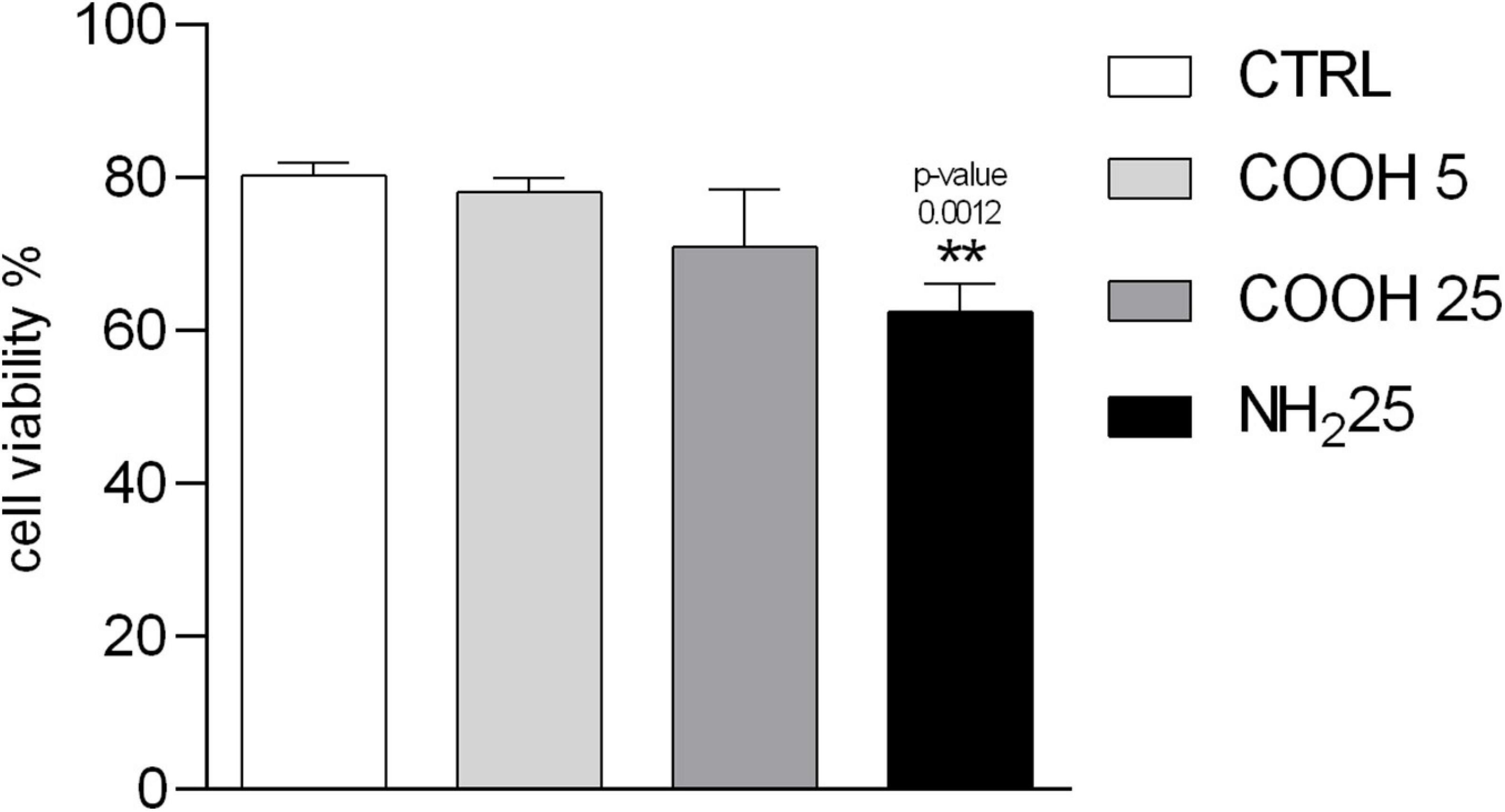 Immune cell viability. Percentage of viable P. lividus coelomocytes vs. total number of cells screened after 4 h of exposure to CF (control), PS-COOH (5 and 25 μg mL–1) and PS-NH2 (25 μg mL–1). Data are reported as mean ± SD (n = 9; Kruskal–Wallis test, Dunn’s post-test, p < 0.01). ** Indicate significant differences with respect to the control group.