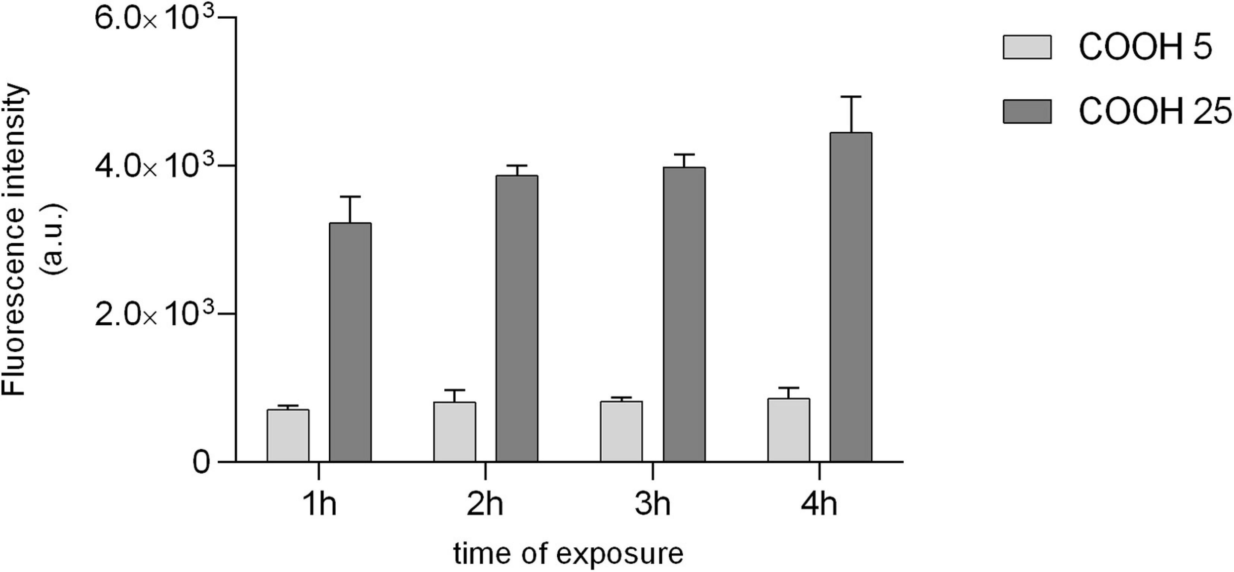 Uptake of PS-COOH in sea urchin phagocytes. Fluorescence intensity (arbitrary units, a.u.) of immune cells exposed to fluorescently labeled PS-COOH (5 and 25 μg mL–1) at 0 h and after 1, 2, 3, and 4 h of exposure. Bars represent mean ± SD (n = 3). Fluorescence intensity values are normalized to the auto-fluorescence signal of the control group (P. lividus cells exposed to CF only) at each time-point.