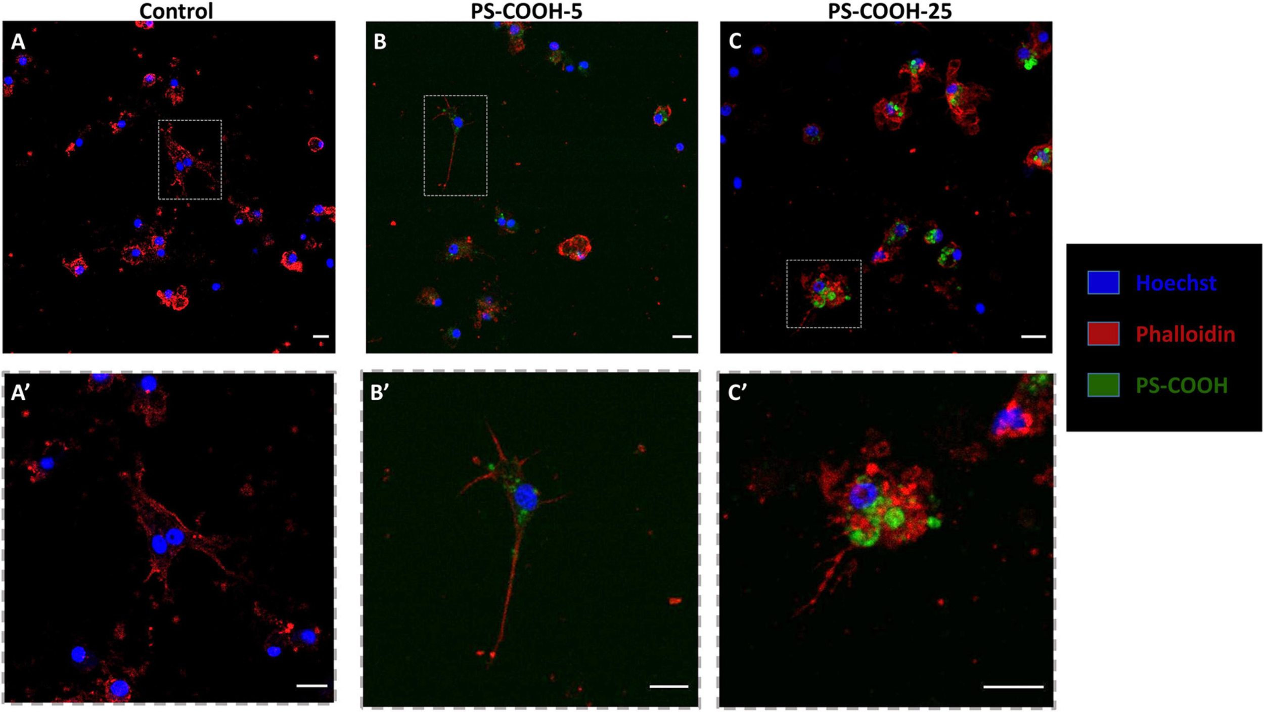 PS-COOH disposition in sea urchin phagocytes by confocal microscopy. (A) Control phagocytes (exposed to CF only). (B,C) Internalization of fluorescent labeled PS-COOH (5 and 25 μg mL−1) in phagocytes of sea urchin P. lividus upon 4 h of exposure (blue: nuclei, red: actin and green: PS-COOH). (A’,B’,C’) Higher magnifications of the areas in the upper images are reported in the images at the bottom. Images were recorded with the same gain using a confocal microscope (Leica TCS SP8X). Scale bar: 10 μm.