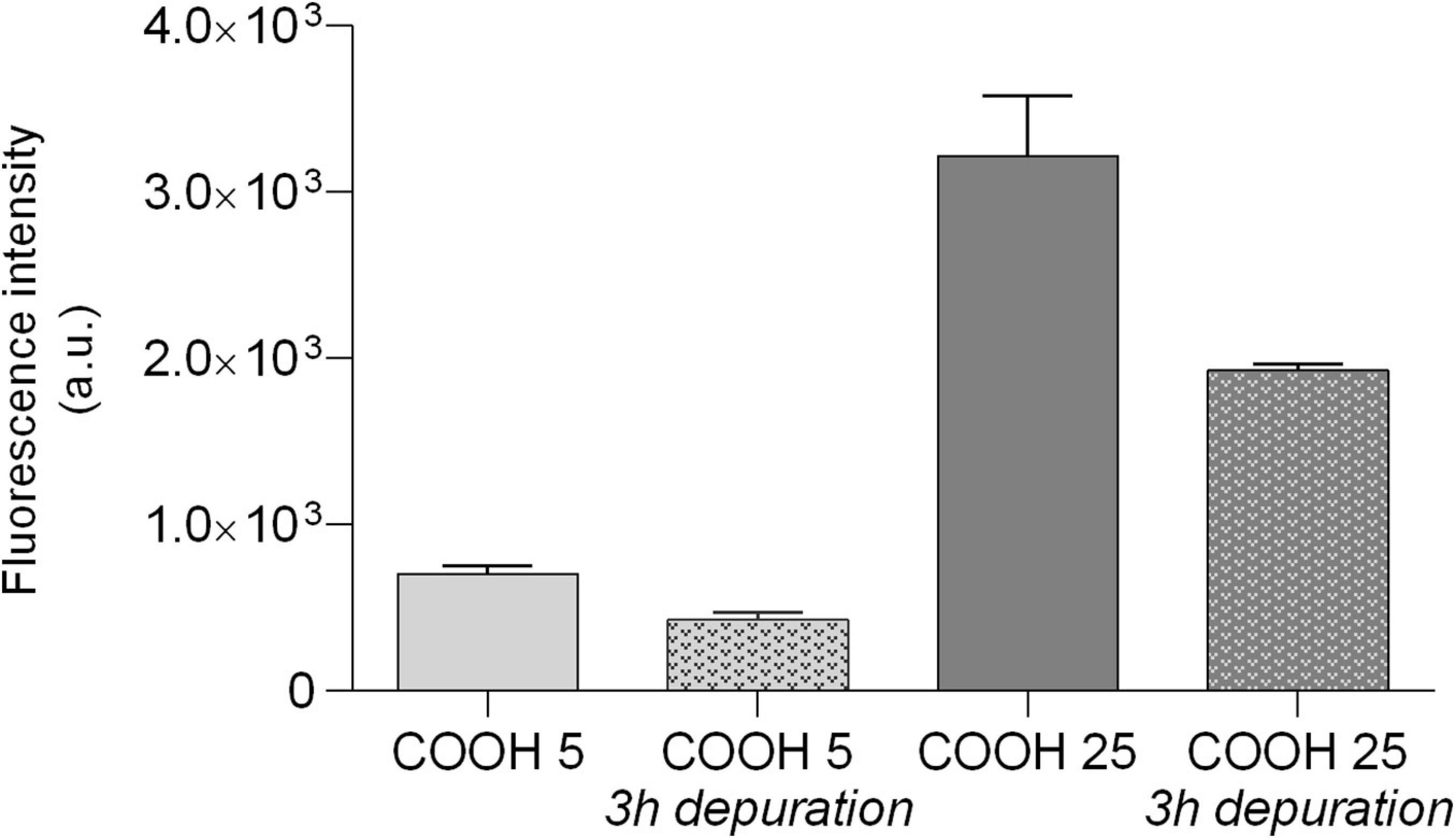 A recovery experiment was also performed in order to estimate the clearance of PS-COOH from coelomocytes. Cell suspensions in CF (300 μL) were exposed to fluorescently labeled PS-COOH for 1 h (5 and 25 μg mL–1), as described above. Cells were then centrifuged at 600 × g for 10 min at 4°C, resuspended in CF (without NPs). After 3 h exposure to CF only, cells were washed in CF and processed for the fluorimetry analysis as described above.