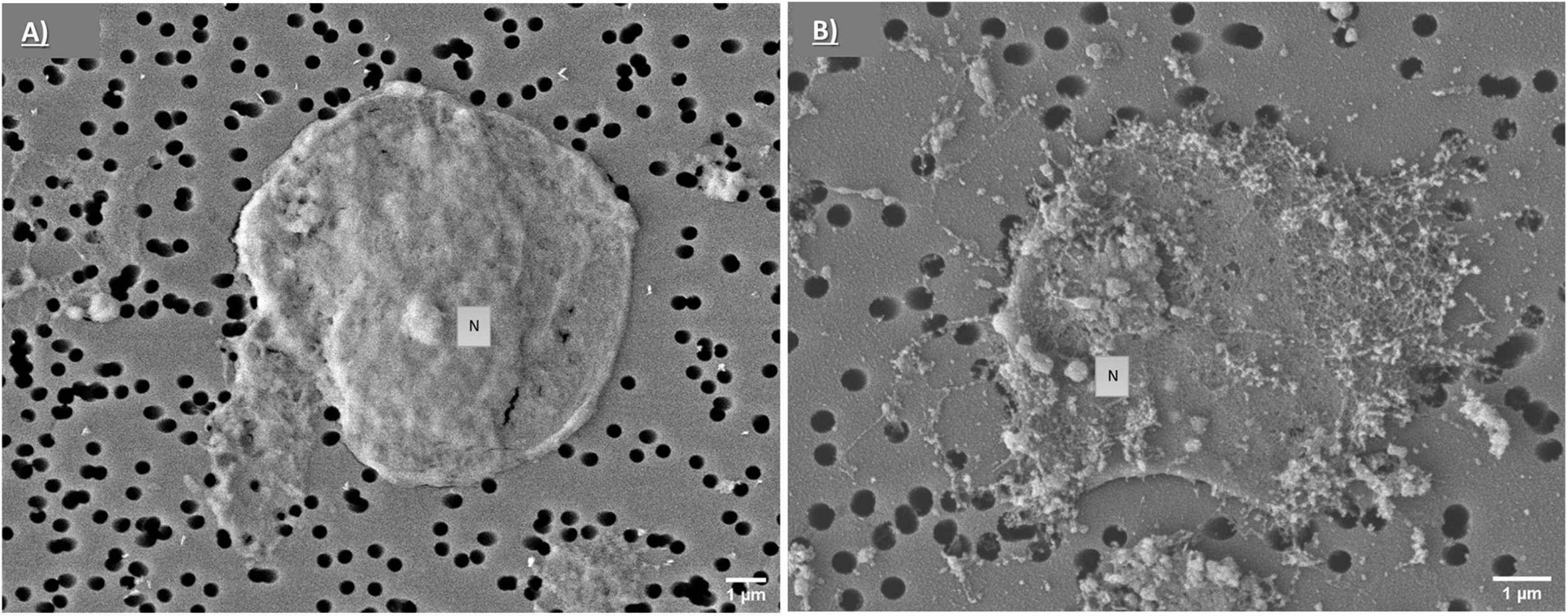 SEM analysis of phagocytes. Representative SEM images of control phagocytes (exposed to CF only) (A) and after exposure to PS-COOH at 25 μg mL–1(B). SEM images acquired using a SEM JSM-6700F coupled to LEI detector. Scale bars: 1 μm.