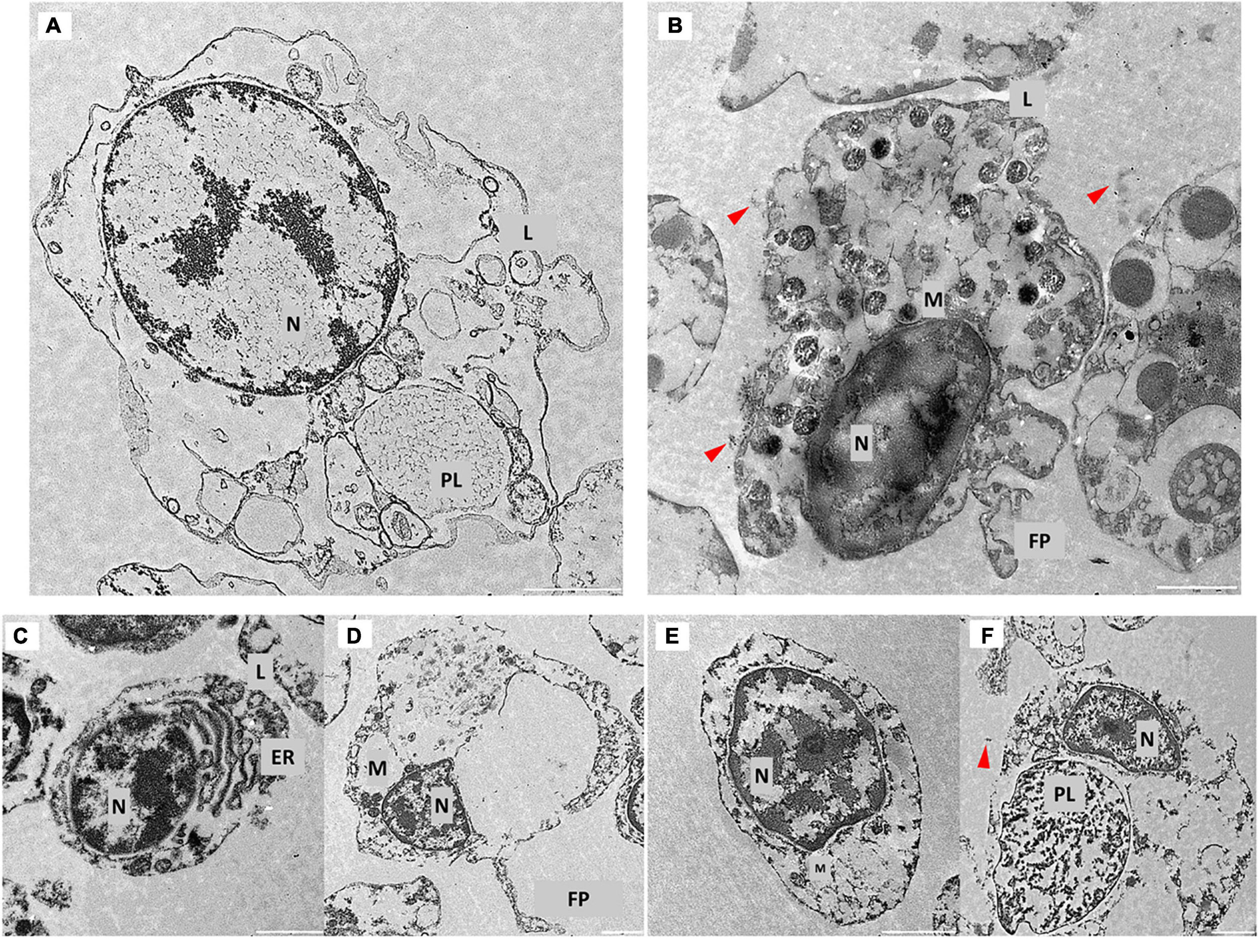 TEM analysis of phagocytes. Representative TEM images of control phagocytes (A,C,D) and after exposure to PS-COOH at 25 μg mL–1(B,E,F). Foreign material around cell surface and membrane damage is shown (red arrows). N, nucleus; M, mitochondria; PL, phago-lysosome; L, lysosome; FP, filopodia; ER, endoplasmic reticulum. TEM images were recorded using a LEO 912AB microscope. Scale bars: 1 μm.