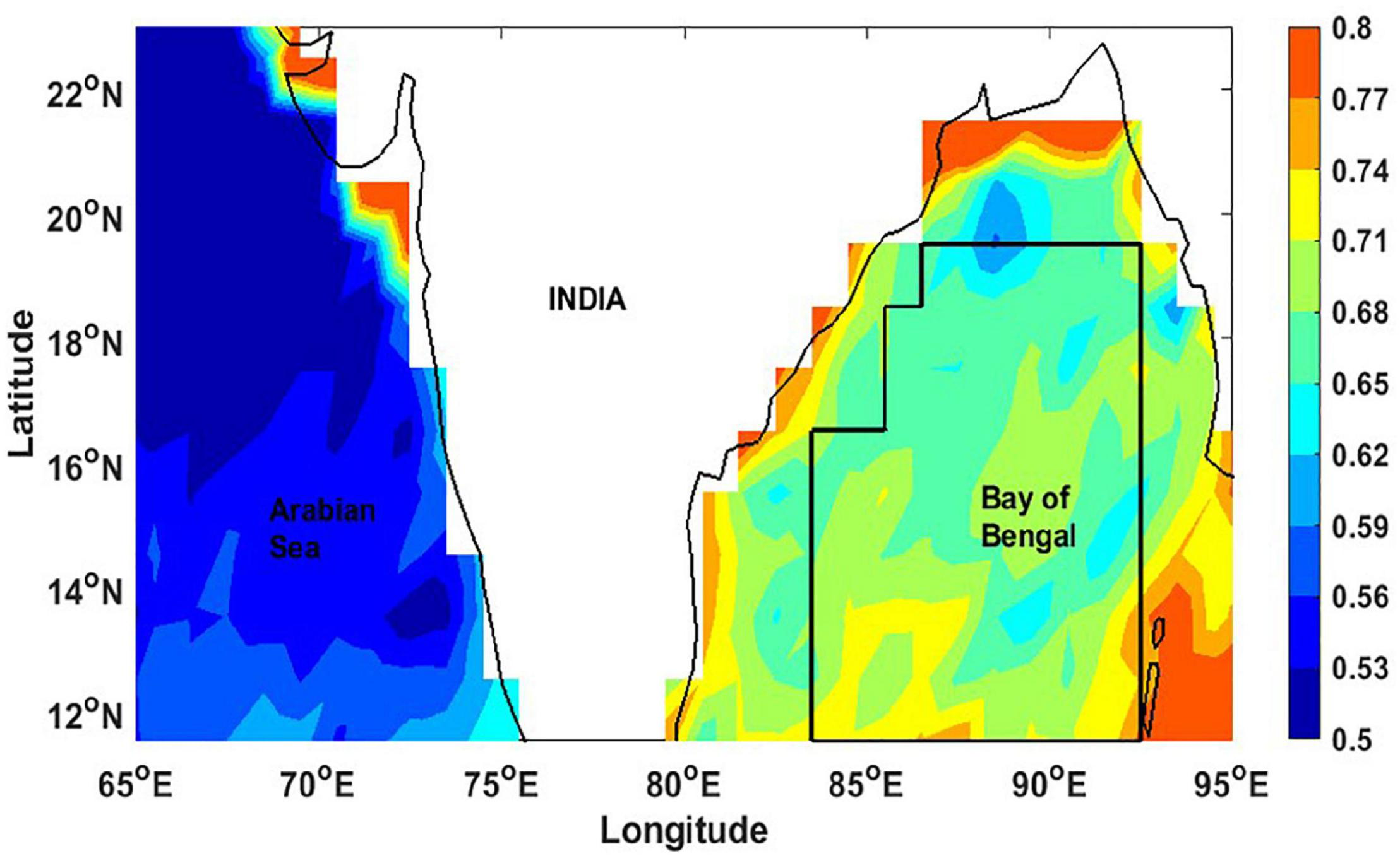 Some of the factors affecting SSTs are solar insolation, warm/cold water advection, and other marine processes, namely ocean currents, upwelling/downwelling phenomena, and eddies (Leeuwenburgh and Stammer, 2001; Shinoda, 2005; Krishna, 2008; Mandal et al., 2019; Buckley et al., 2020). In addition, the BoB also receives a sizable freshwater influx from the rivers and undergoes near-surface ocean-atmosphere interactions, which alters the upper ocean processes (Parampil et al., 2010). Past studies have revealed that the circulation in the BoB is primarily wind and buoyancy-driven (Schott and McCreary, 2001; Schott et al., 2002; Liu and Alexander, 2007), which also modulates the surface and subsurface properties in the BoB. These multiple influences induce large variability in SST, with a monotonic decrease toward the South (Srivastava et al., 2018), coinciding with the spatial variability of aerosol loading (Satheesh et al., 2010), indicating a potential relationship.