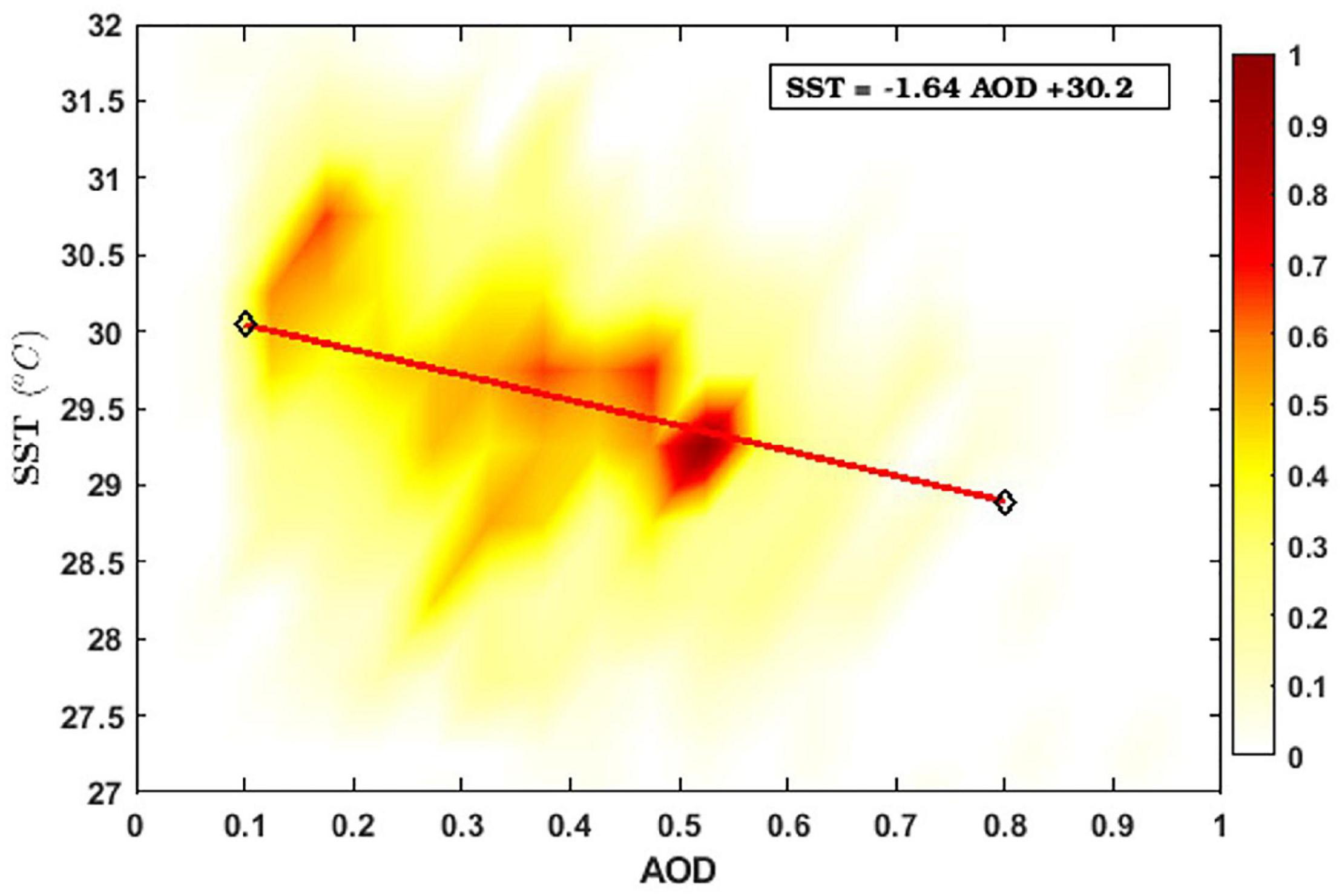 An attempt is made to estimate the change in SST as a function of AOD using daily raw AOD and SST datasets during April 2003–2019 (510 days of data over a large spatial scale with 101 grid points). These datasets have undergone the initial quality checks mentioned in the section “Data and Methods” and correspond to method 1. Figure 3 shows the contour density plot to establish the relationship between SST and AOD. The SST decreases with an increase in AOD. The value of the slope implies that an increase in unit AOD leads to a roughly 1.64°C decrease in temperature. Therefore, this simple estimate reveals that, on average, a 0.1 difference in AOD may cause SST to change by 0.16°C.
