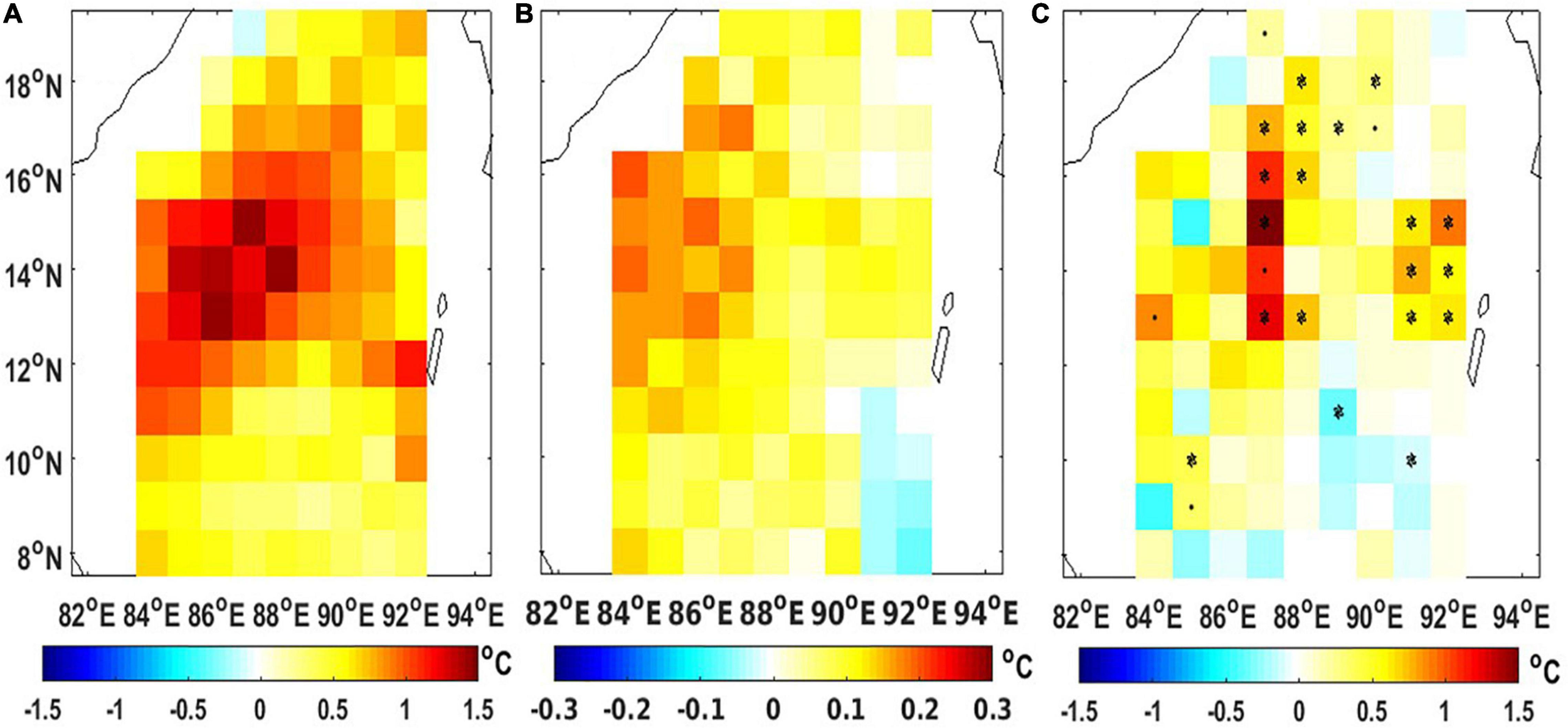 Detailed analysis of all these factors is beyond the scope of this work and hence is not attempted. However, most grids show warming close to or greater than 0.2°C (Figures 4B,C, shown as yellow contours). These numbers are comparable to those obtained earlier in method 1 (an average of 0.16°C corresponding to a 0.1 change in AOD). This spatial pattern (Figure 4B) for April 2020 coinciding with the high-temperature anomaly (Figure 4A) provides confidence that AOD decline led to the observed warming. Thus, it may be said that the SST change is in part modulated by a significant decline in aerosol loading due to COVID-19 lockdown over the BoB.